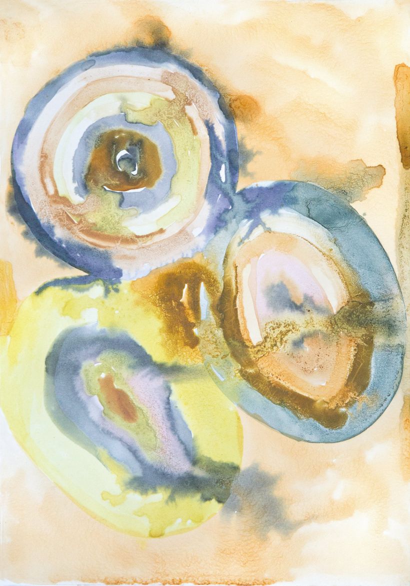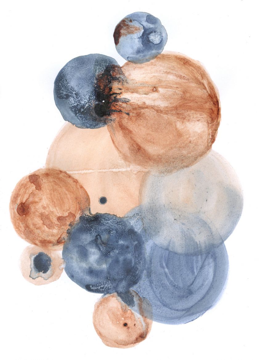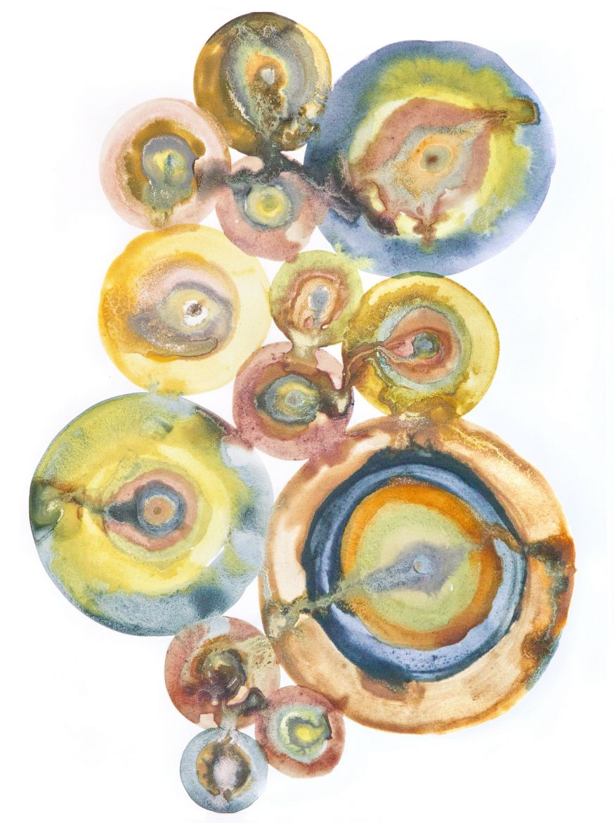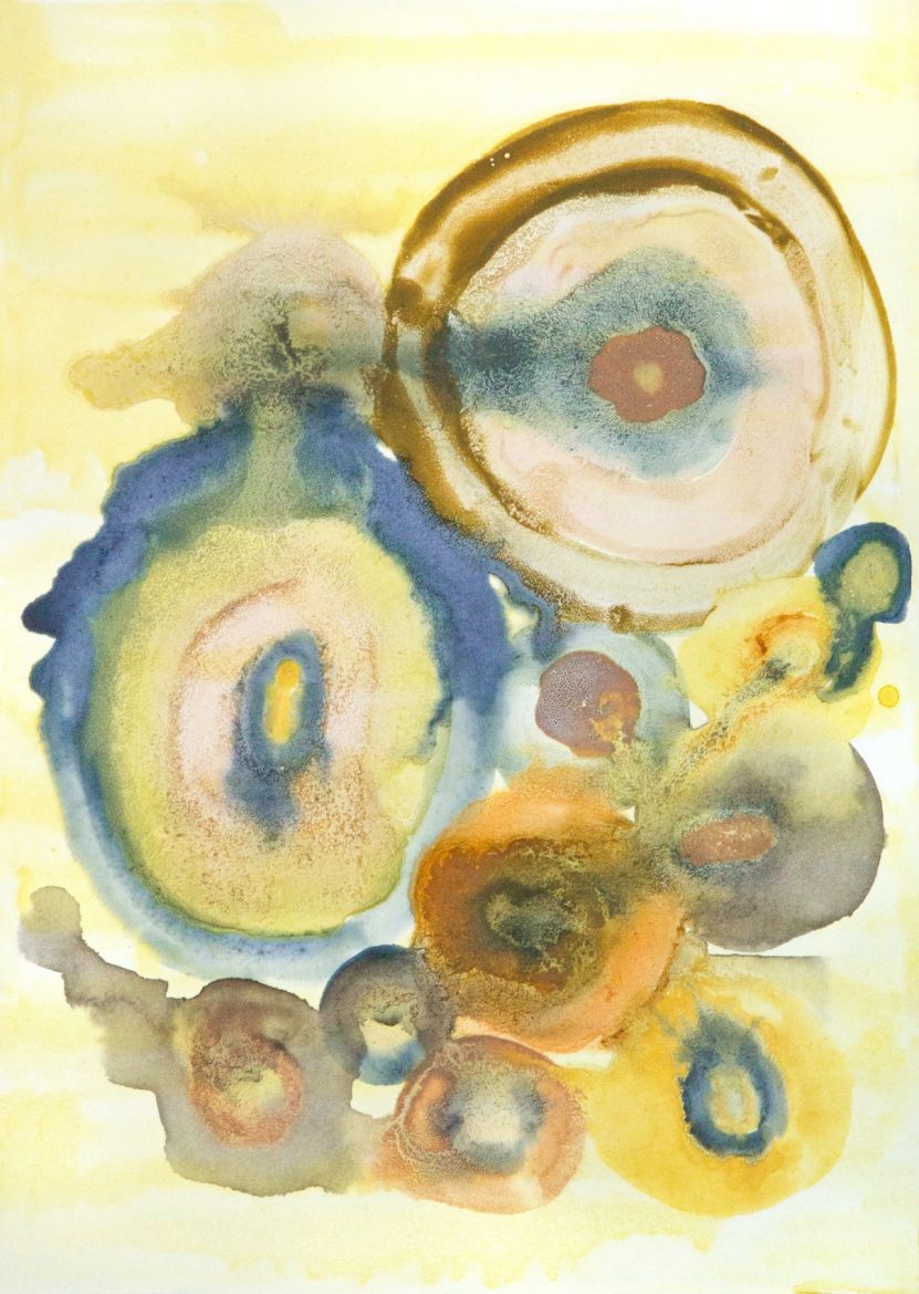 Sang menstruel et pigments végétaux (baies de troène, phytolaque, peau d'oignon jaune, cassis) sur papier