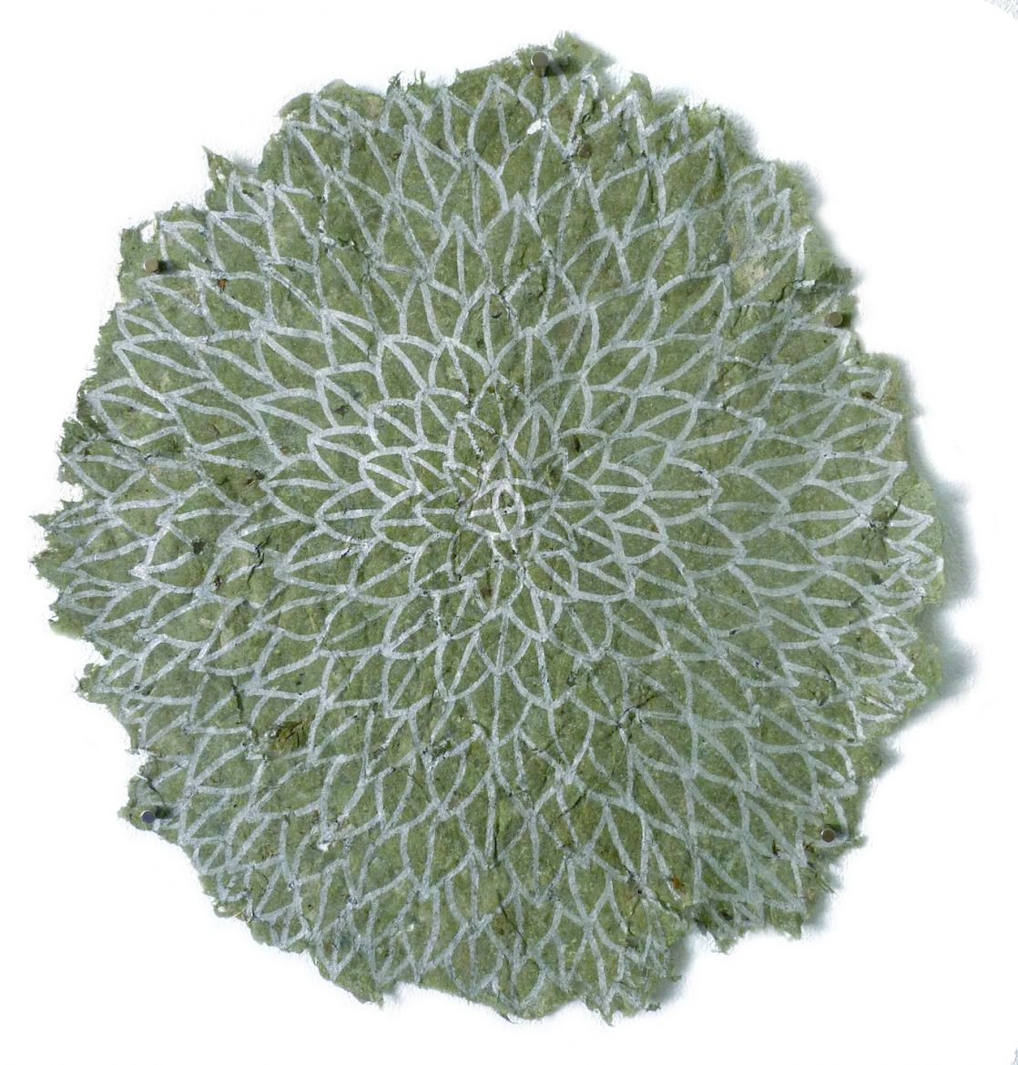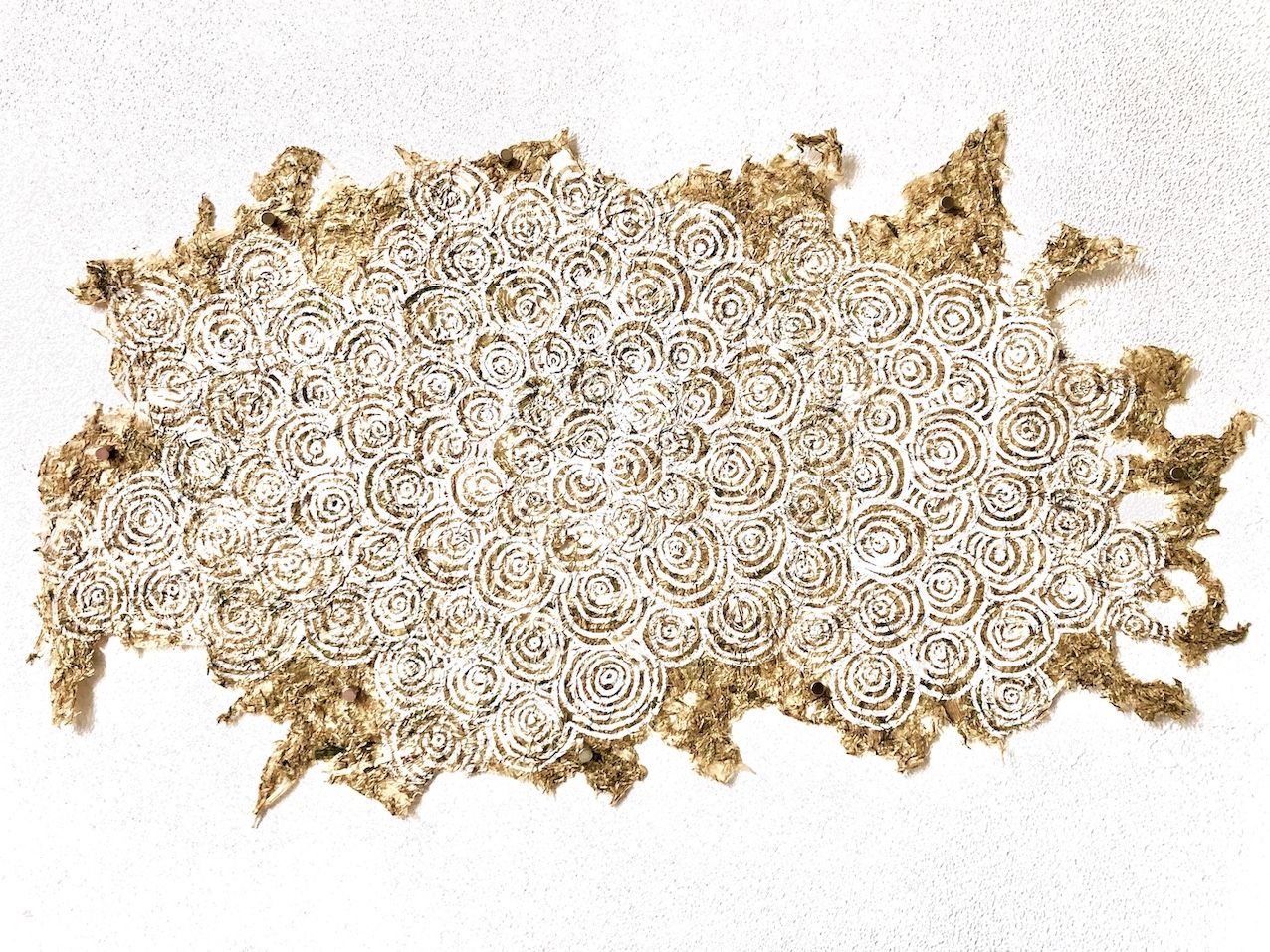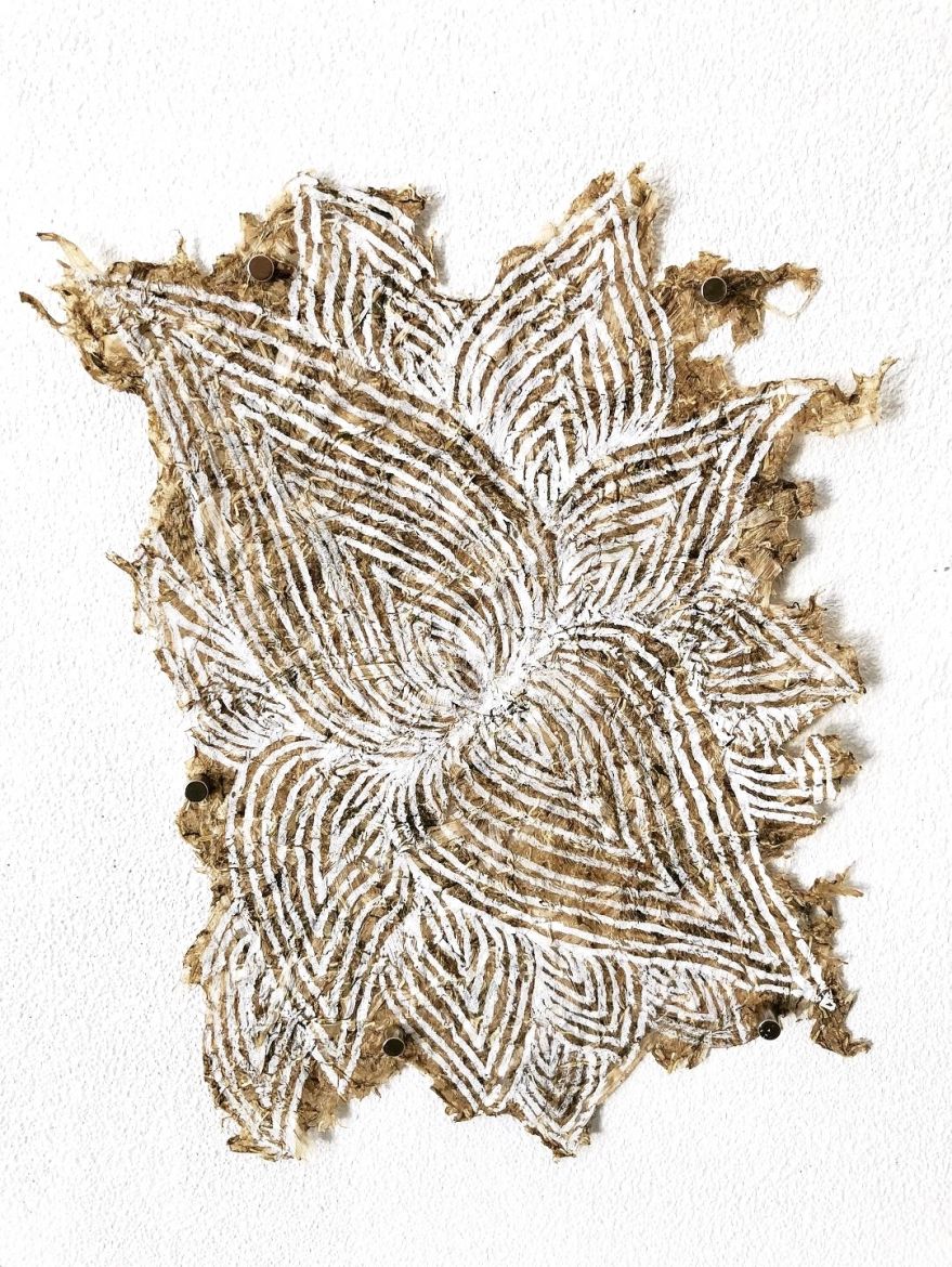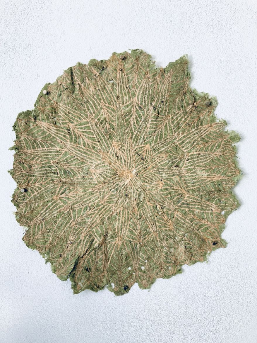 Acrylique sur papier de plantes (iris des marais, liber de chêne, gaillet gratteron, ortie)