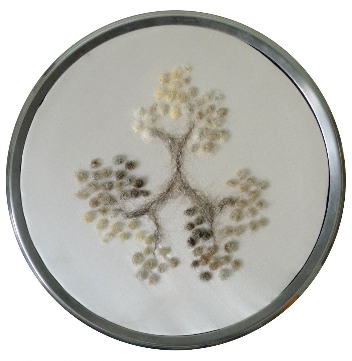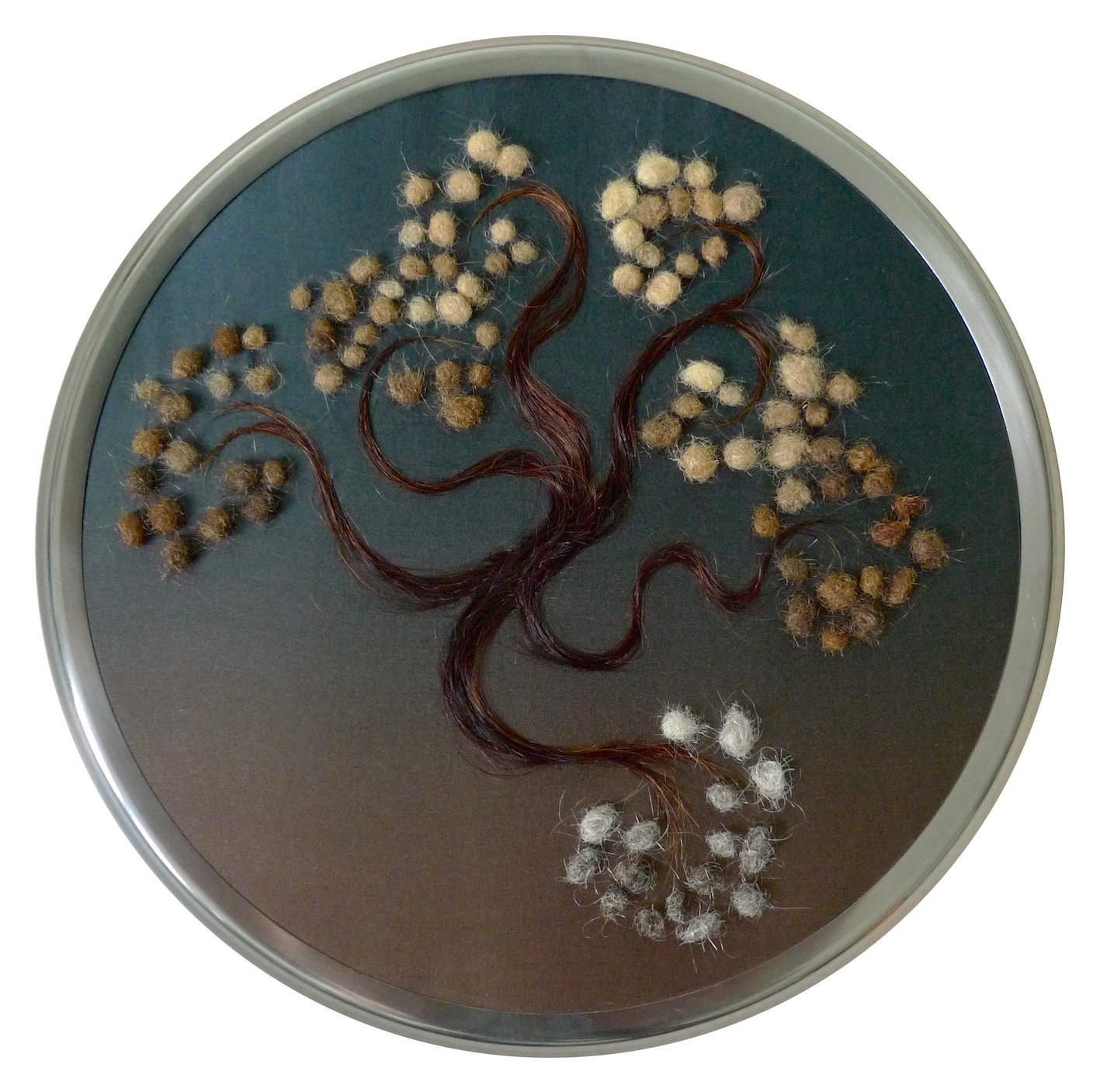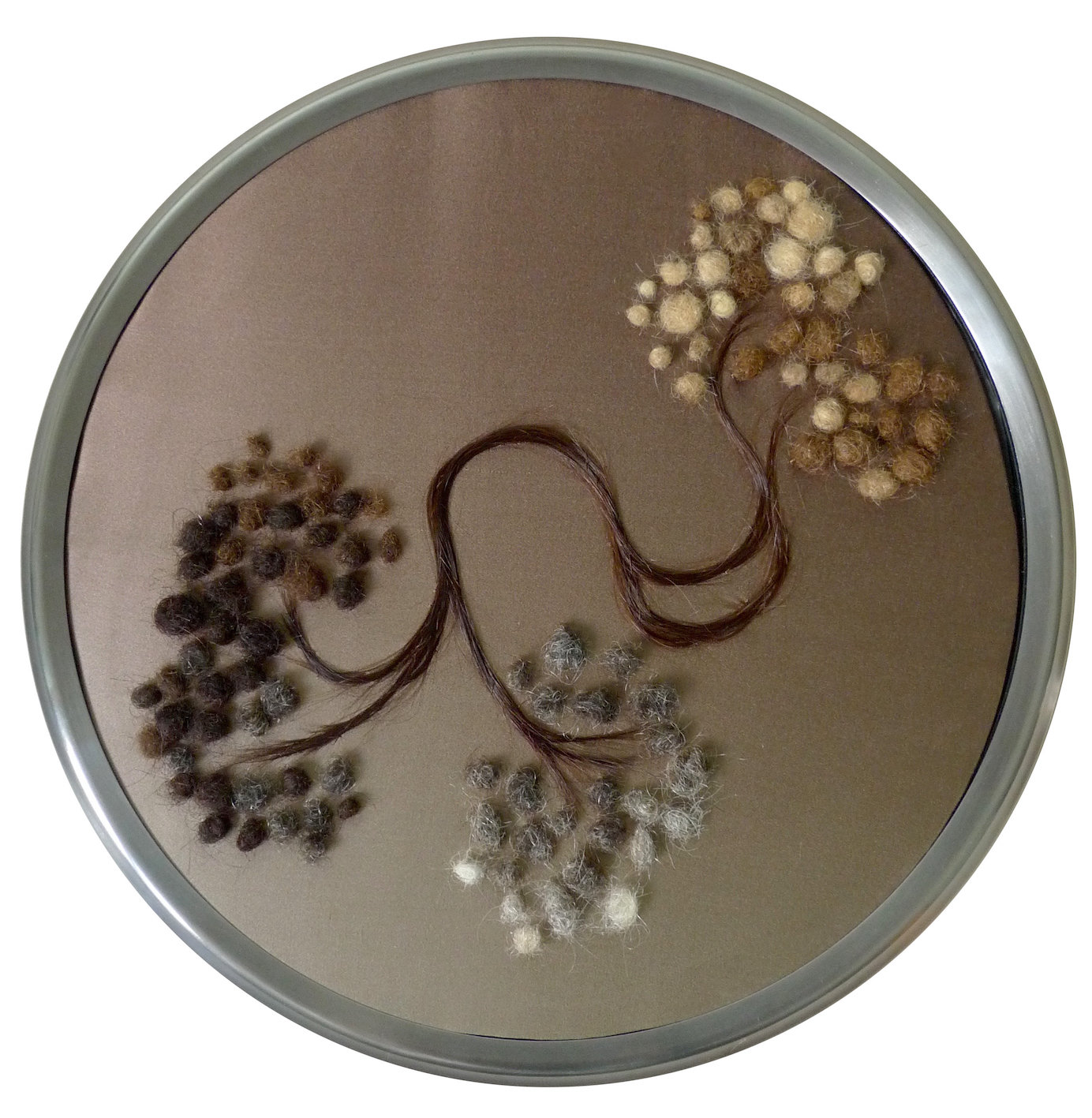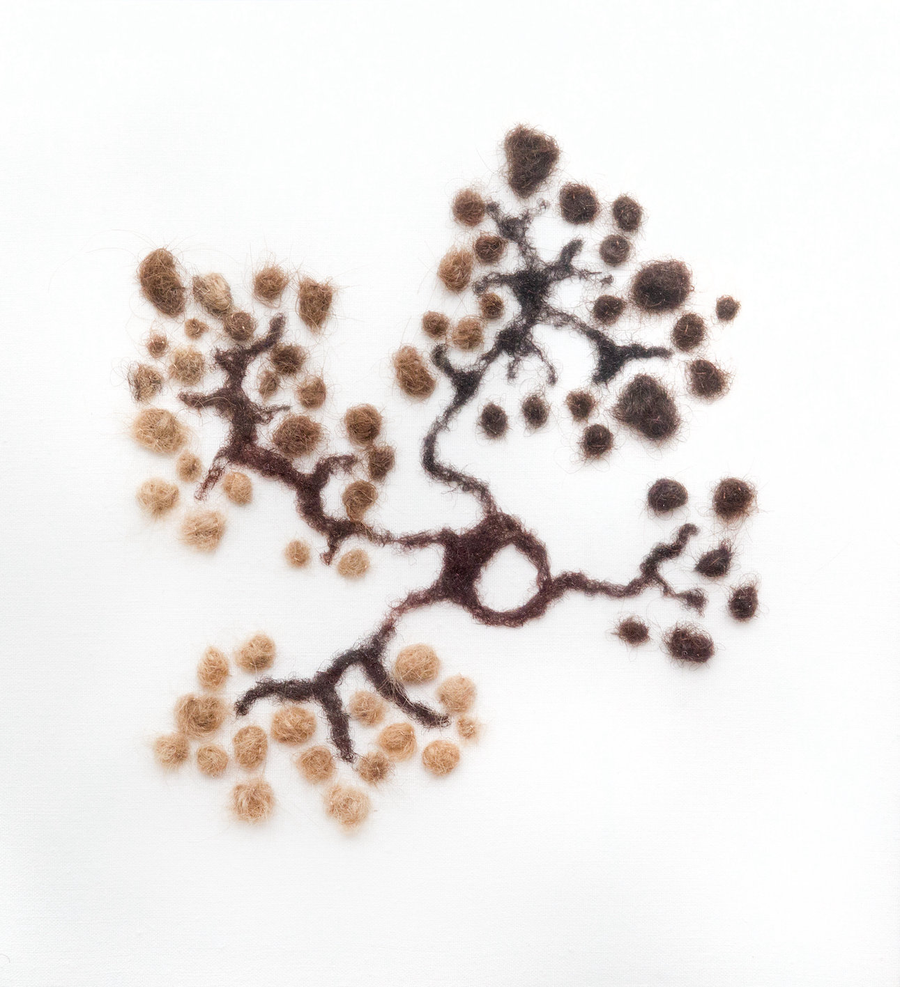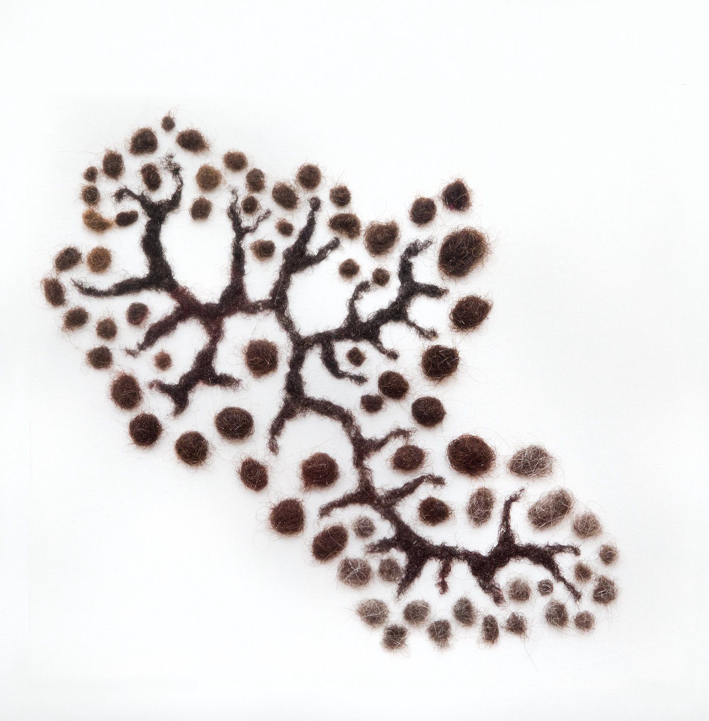 Les cheveux sont roulés sous forme de boulettes ou filés en ramifications. Ils sont le fruit d’une récolte quotidienne par six femmes, collectant les brins se détachant de leur chevelure pour les accumuler comme on égraine le temps. Ces six femmes, perçues à travers les différentes natures de cheveux, apparaissent comme les figures des Parques, ou des marraines fées, qui filent les vies humaines, leur accordant les attributs et orientant le sort de chacun. Cette couverture est à la fois une protection bienveillante pour le nouvel être et un héritage, un enracinement dans un temps qui précède son existence, avec lequel il est lié.
