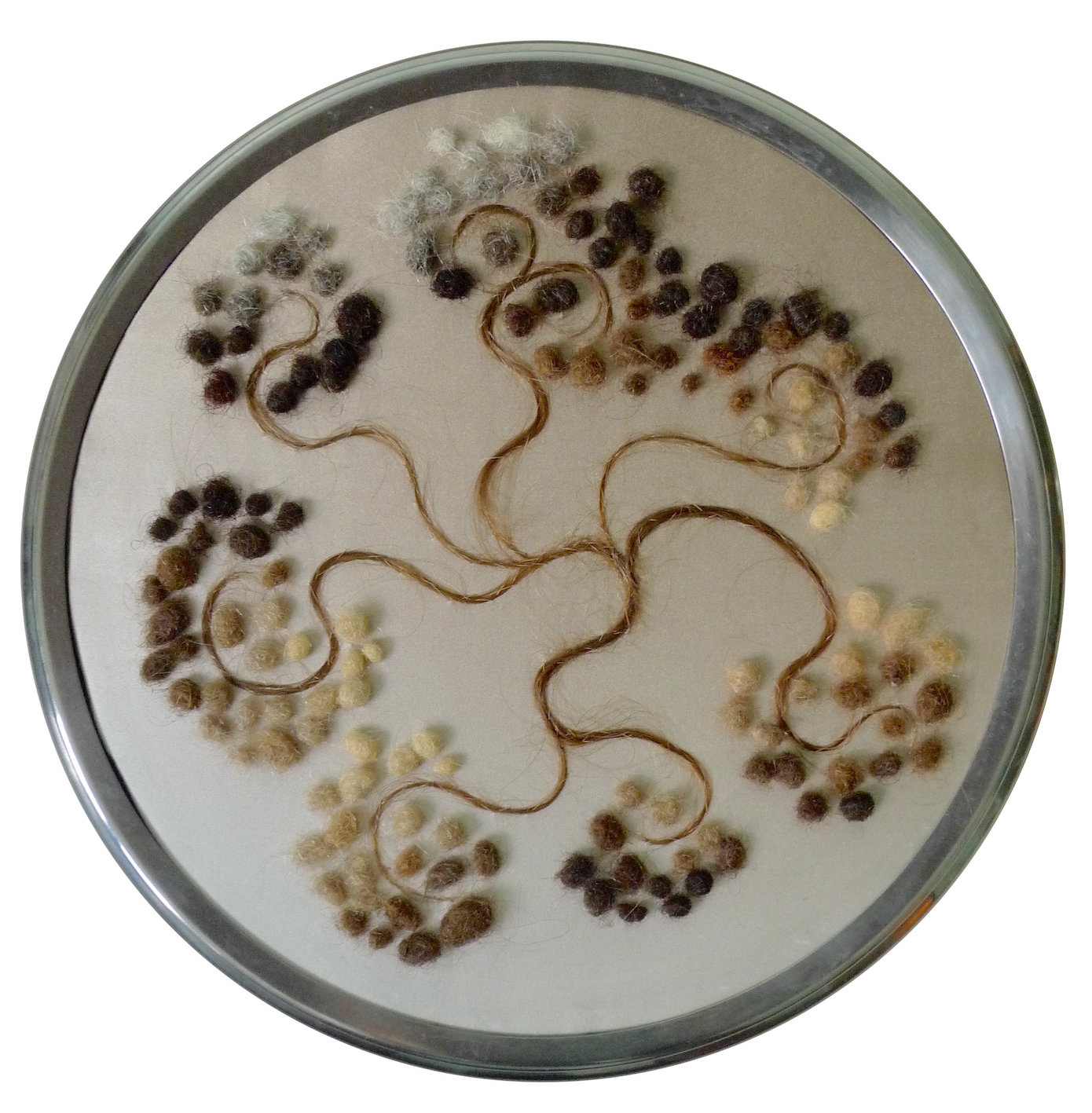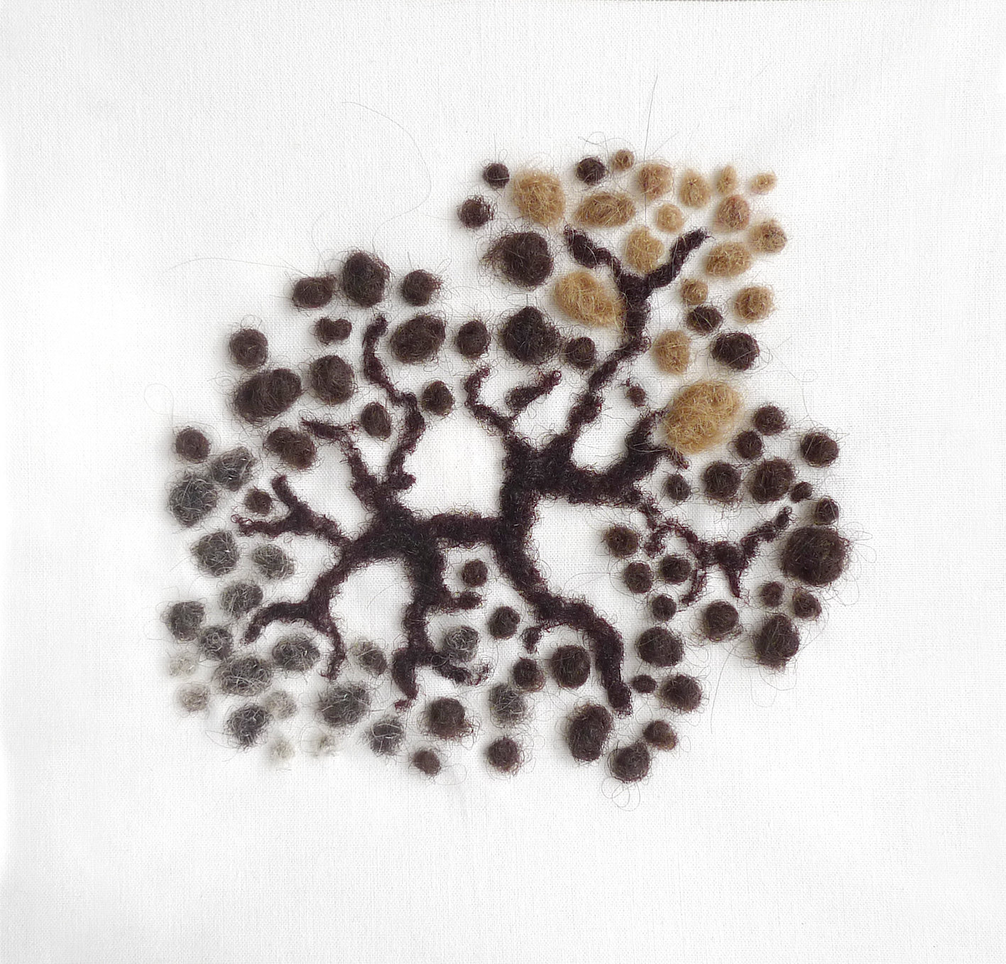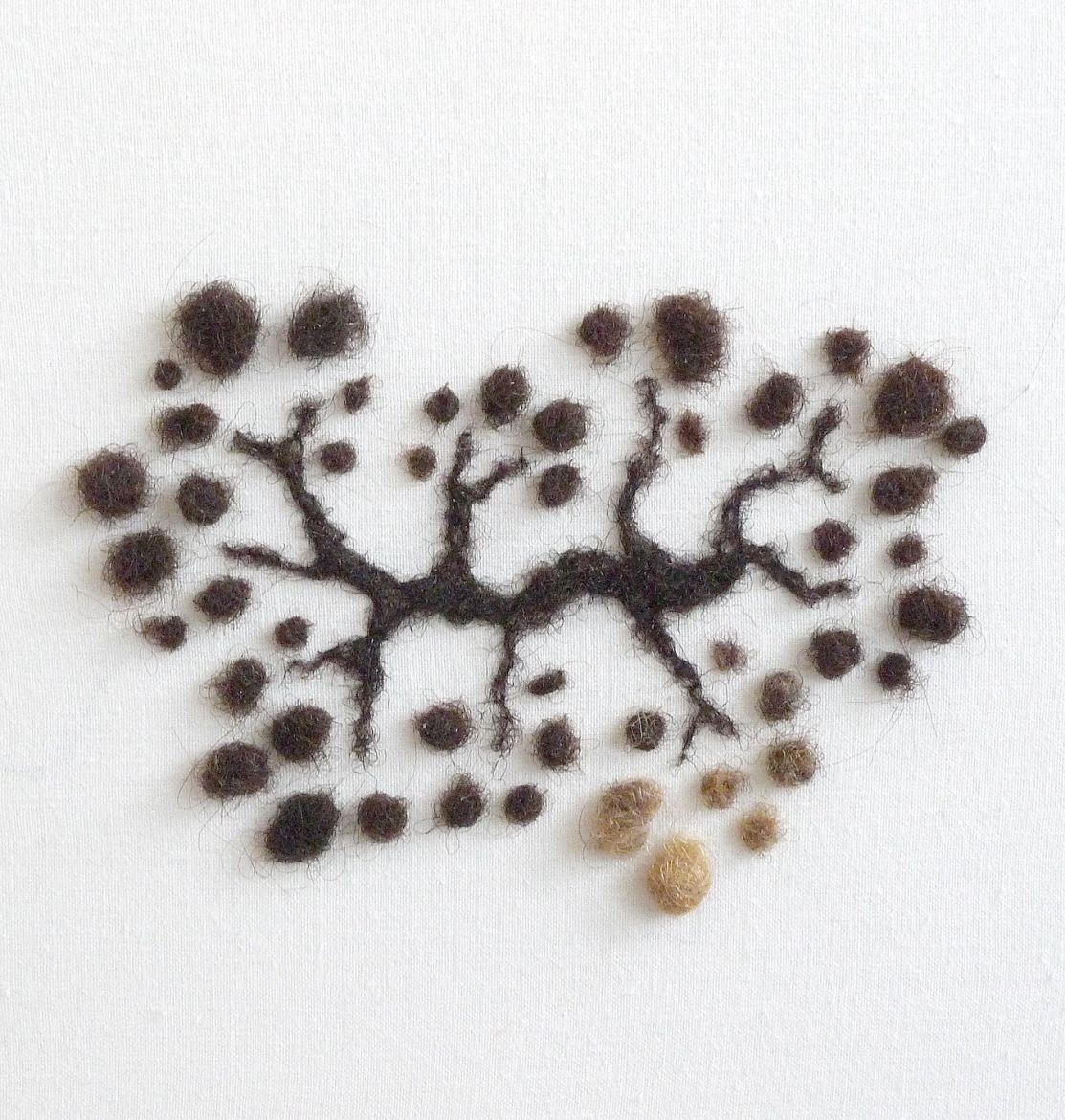 Des mèches de cheveux crépus sont filées pour former des ramifications. Y sont associées des boulettes de cheveux de tous âges, du bébé au vieillard pour former des rhizomes. Chaque rhizome a sa personnalité : sa densité, son développement, son rythme. Ils sont comme la traduction de parcours de vie où tous les évenements sont reliés pour former une totalité à la fois achevée et en expansion permanente.