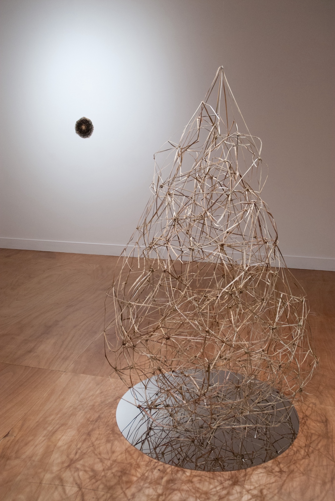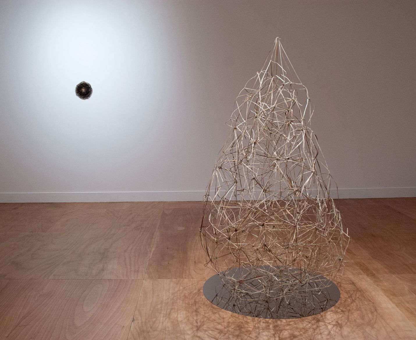 Feuilles de phormium divisées et nouées avec disque d'acier miroir,