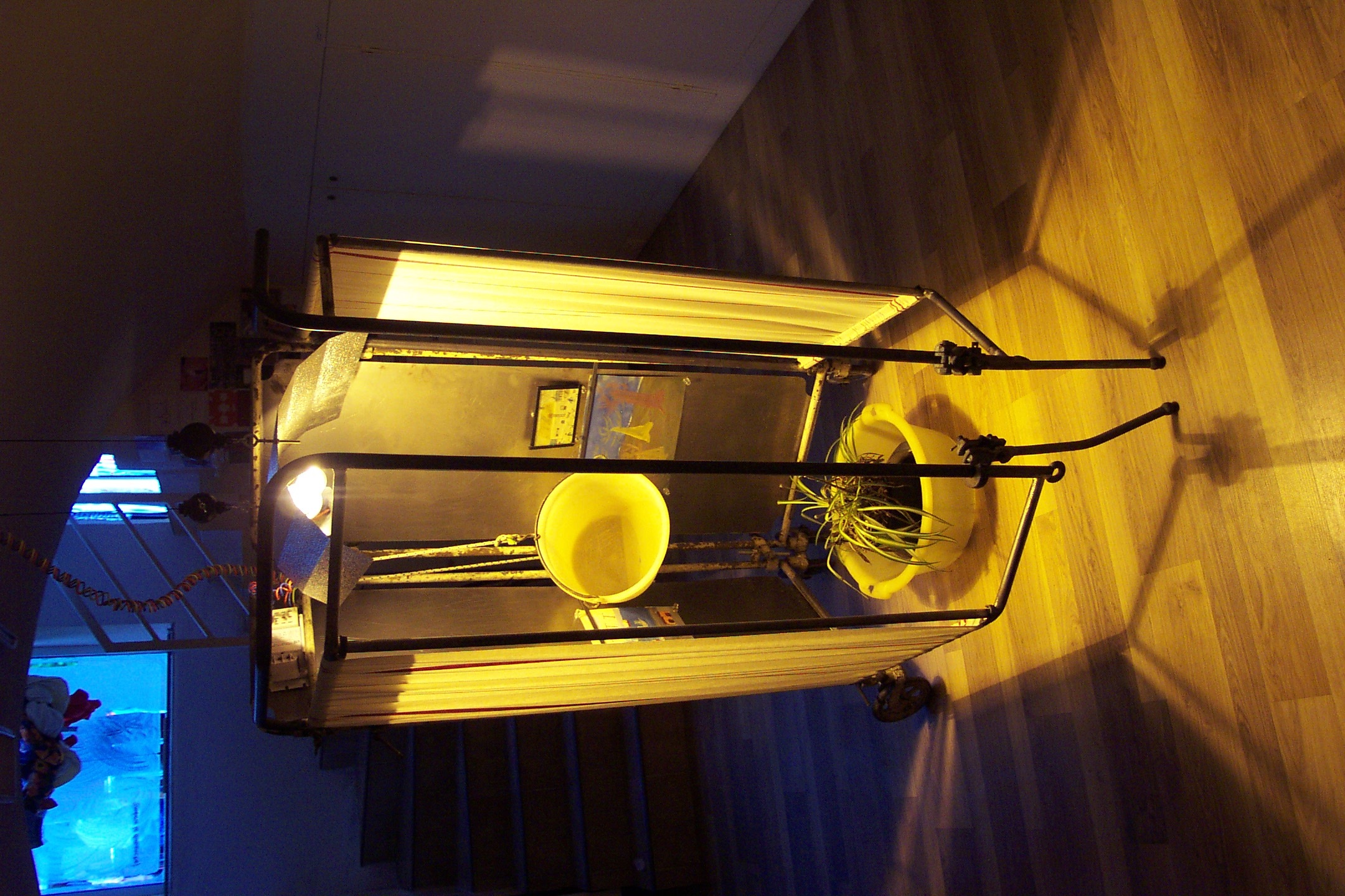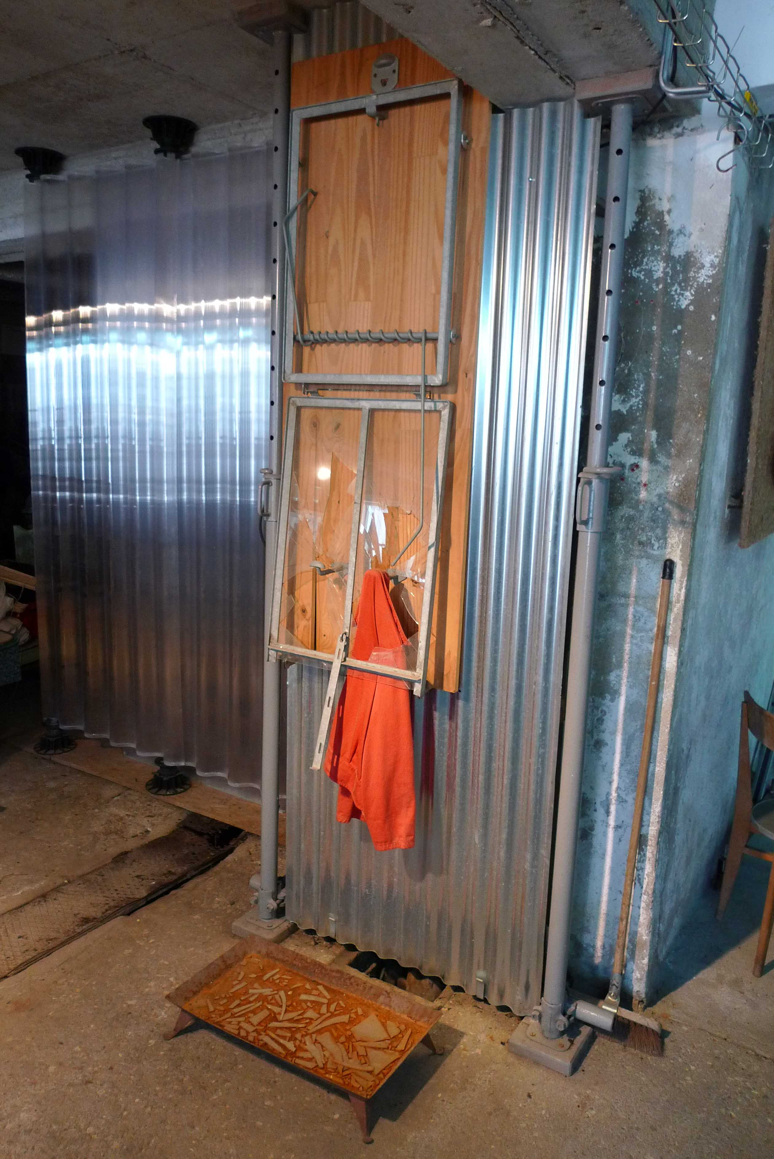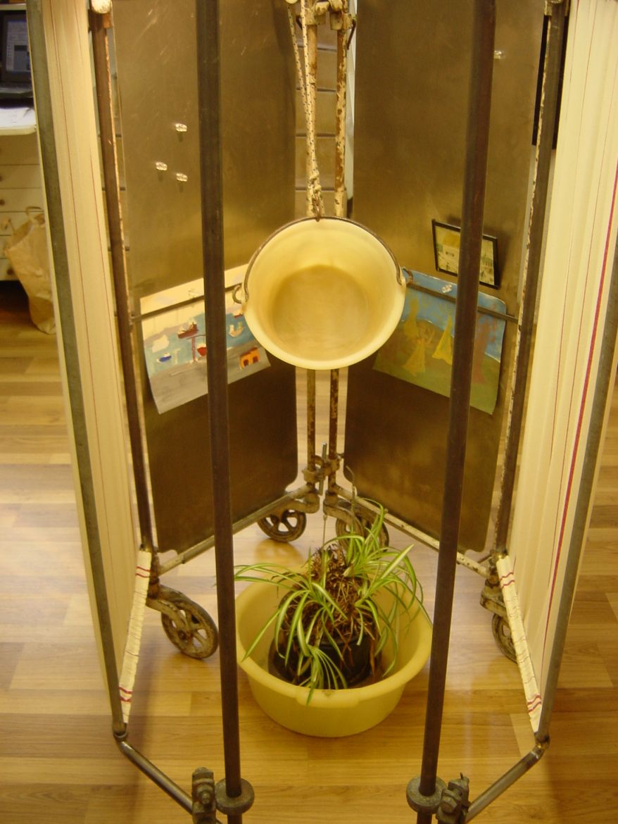 La main verte : paravent , tubes et tôles acier, tissus bassine et seau en plastique, récipient Pyrex, plante verte, lampe.