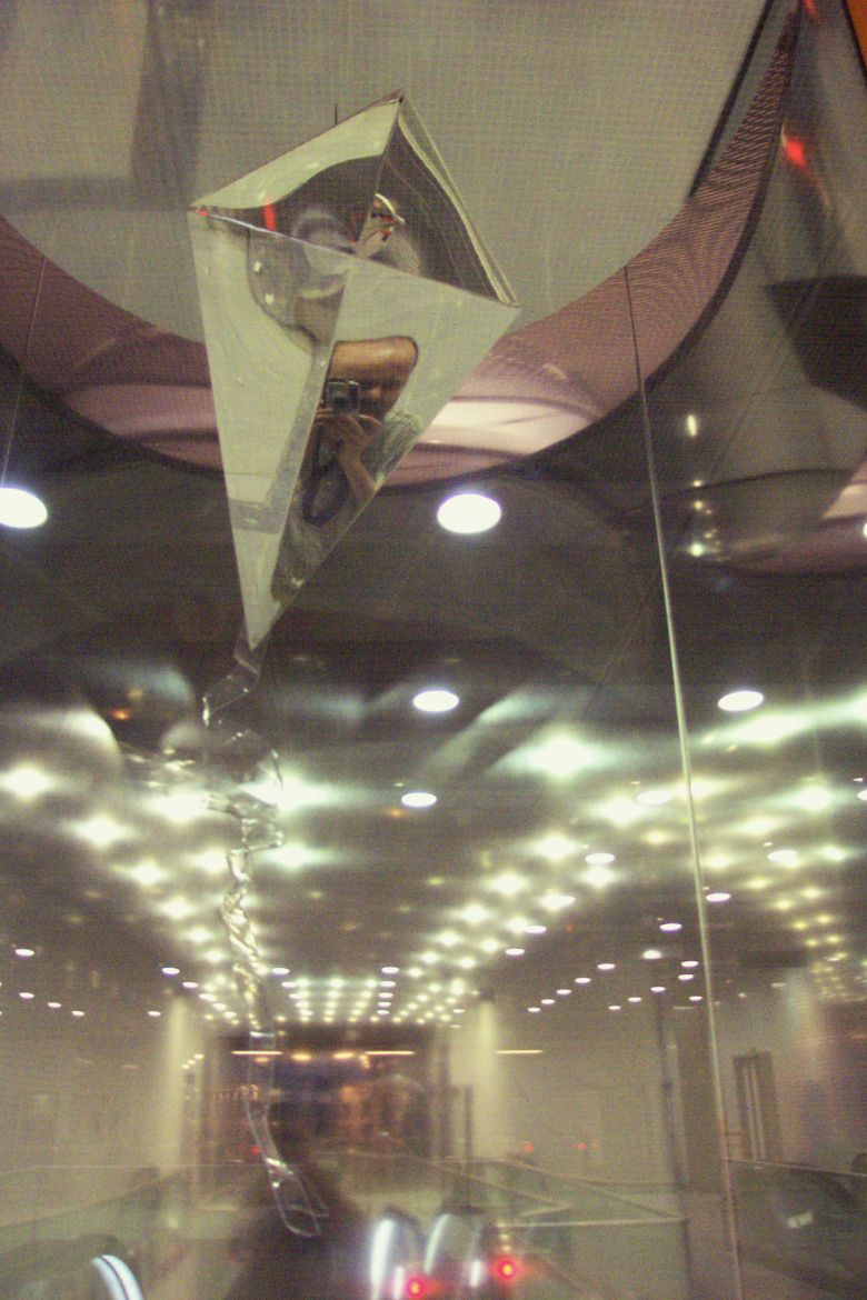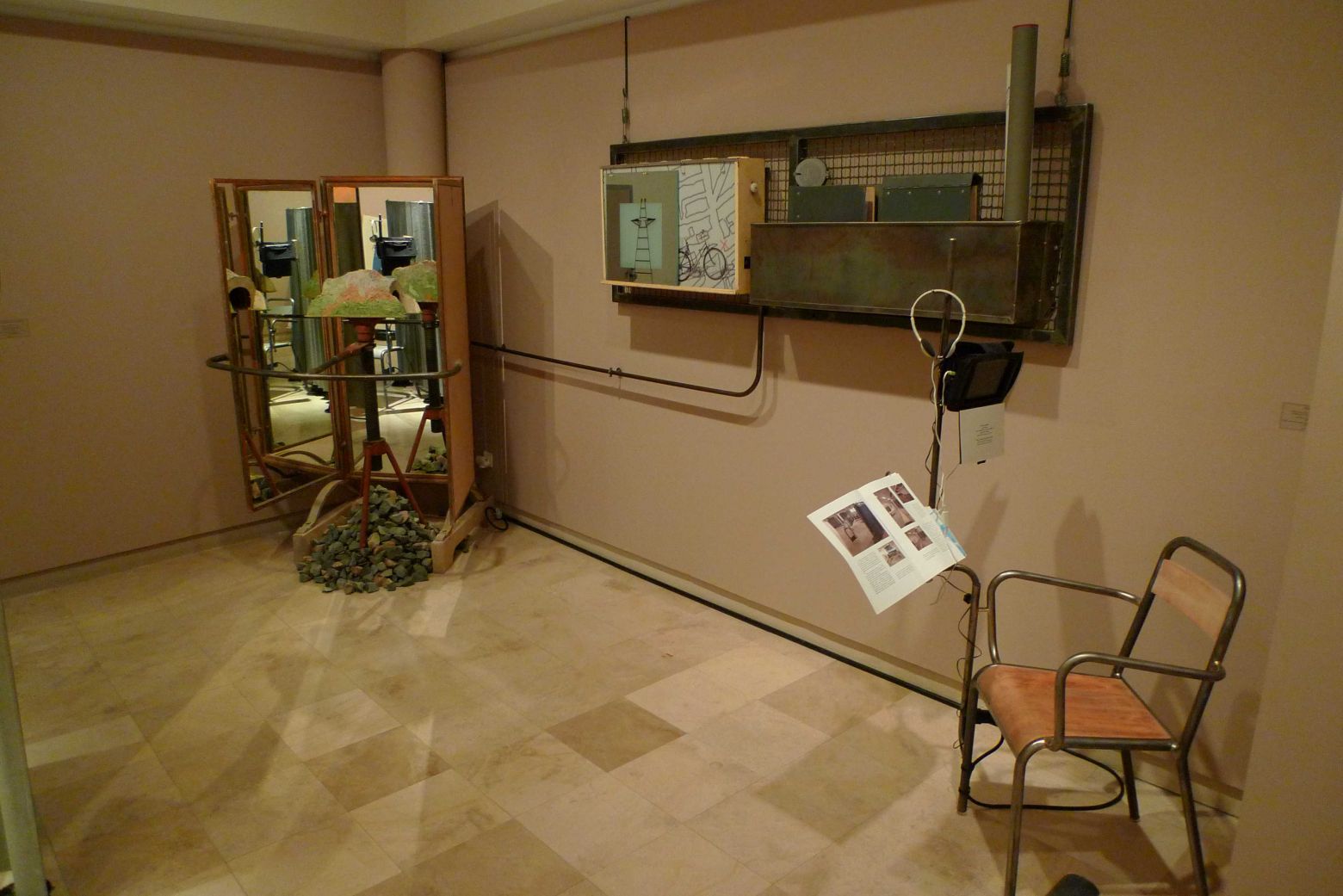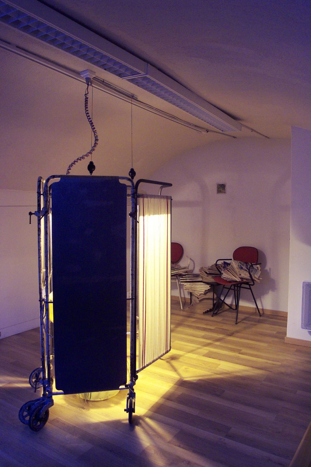 La main verte : paravent , tubes et tôles acier, tissus bassine et seau en plastique, récipient Pyrex, plante verte, lampe.