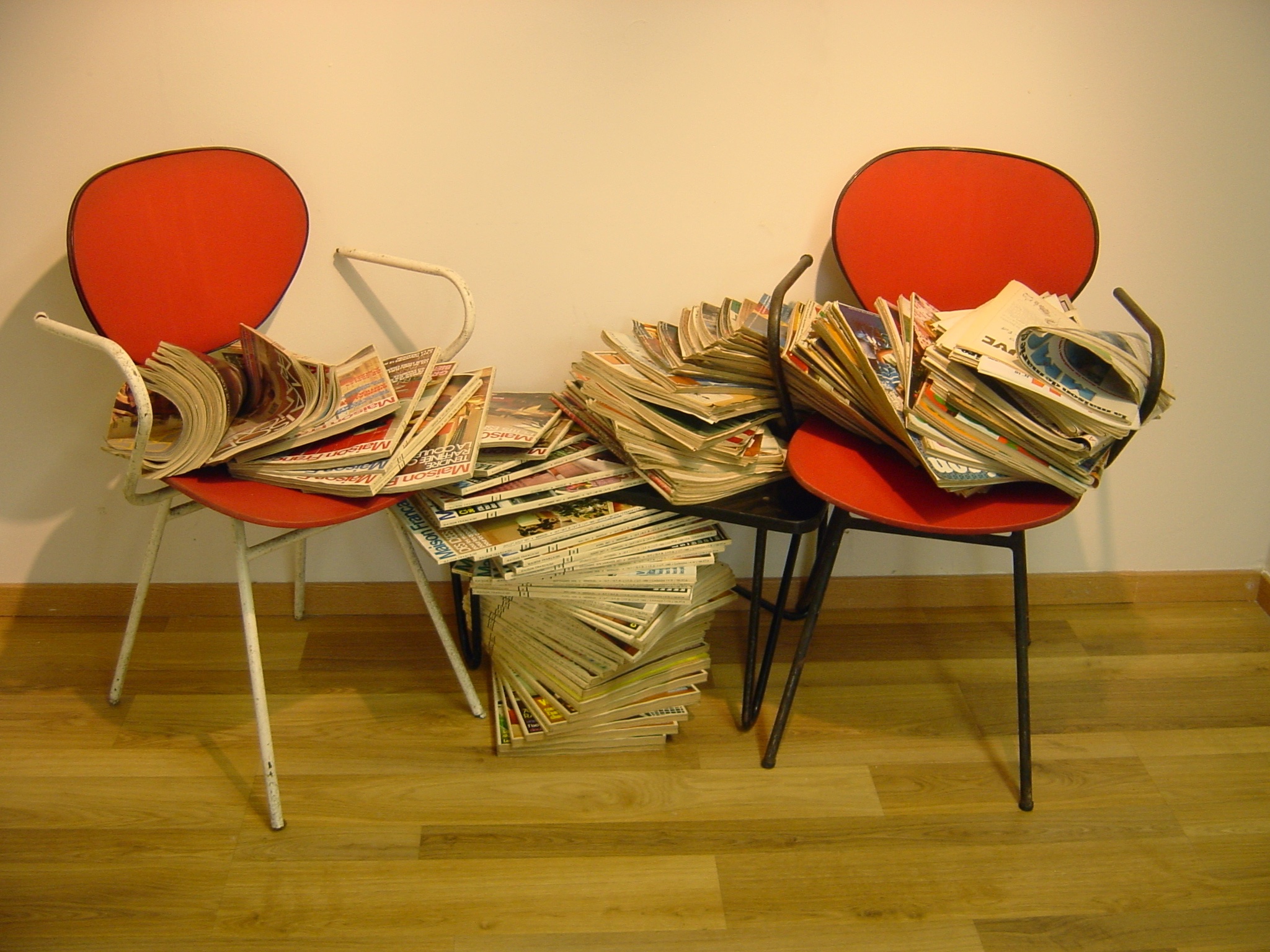 2 chaises, table basse, collection de revues de décoration (Maison Française n° 265 à 335, Maison de Marie Claire)