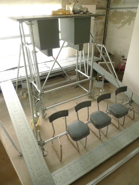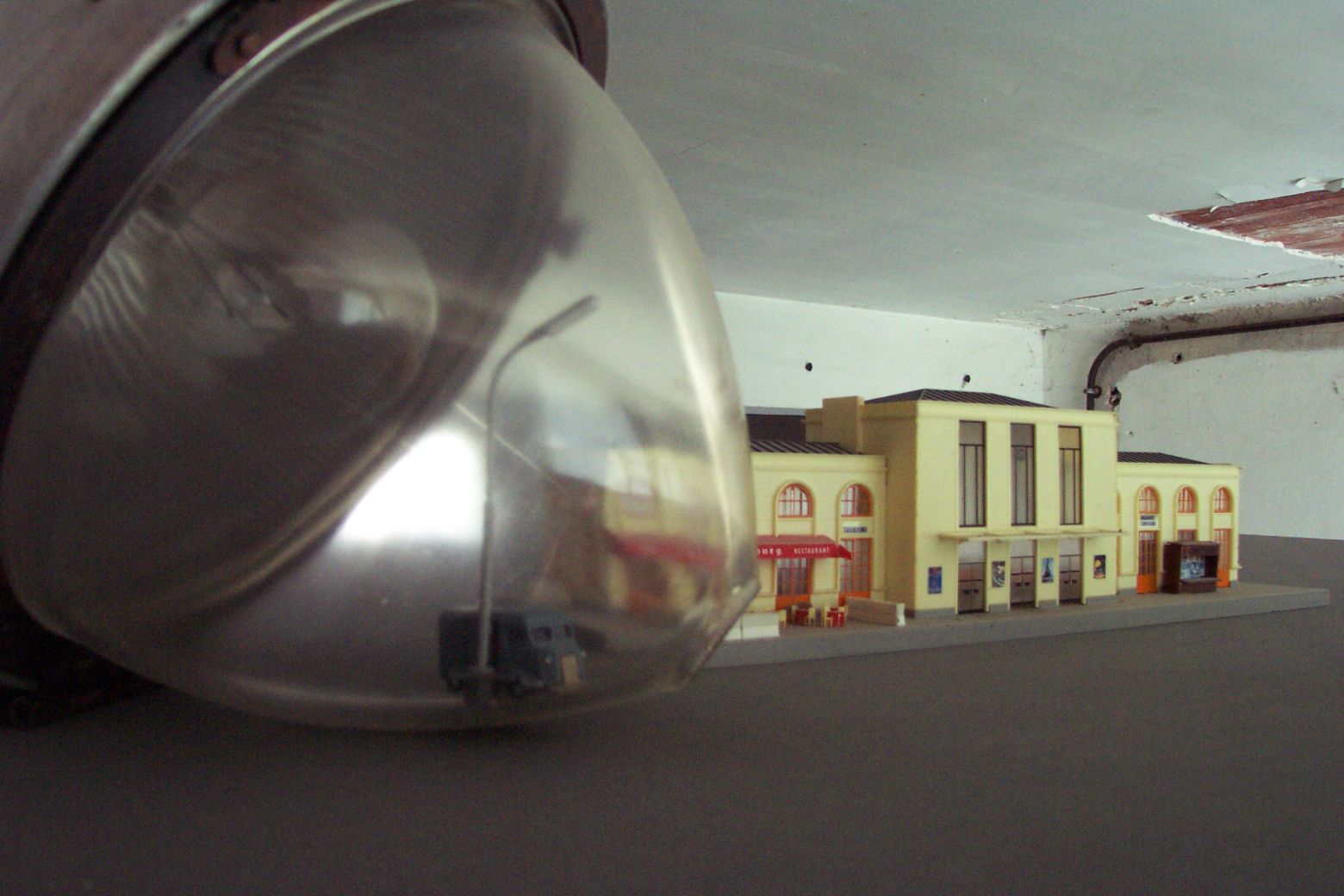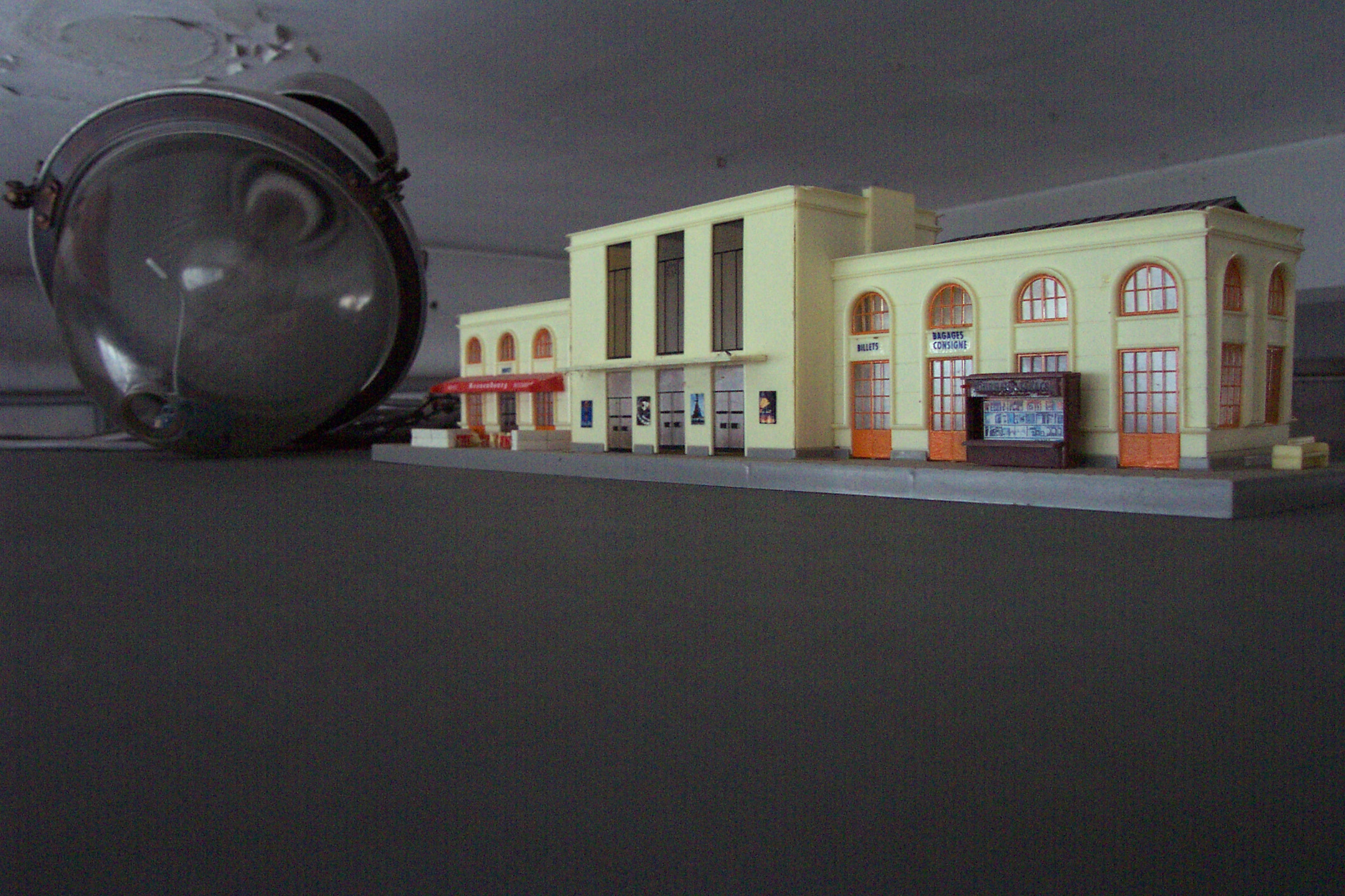 4 chaises acier et skaï, bureau administration année 50, maquette de gare avec accessoires, éclairage public, machine à écrire sur table