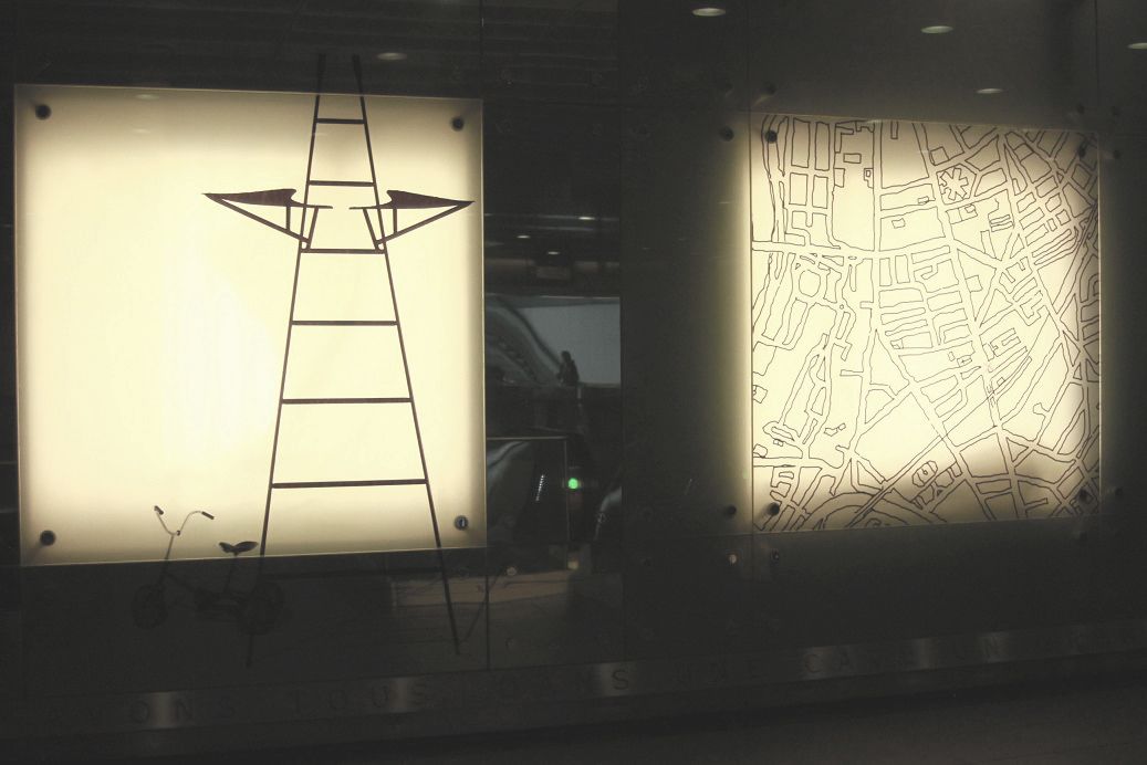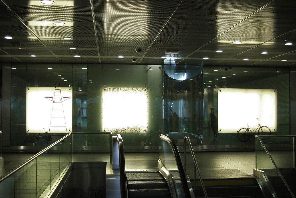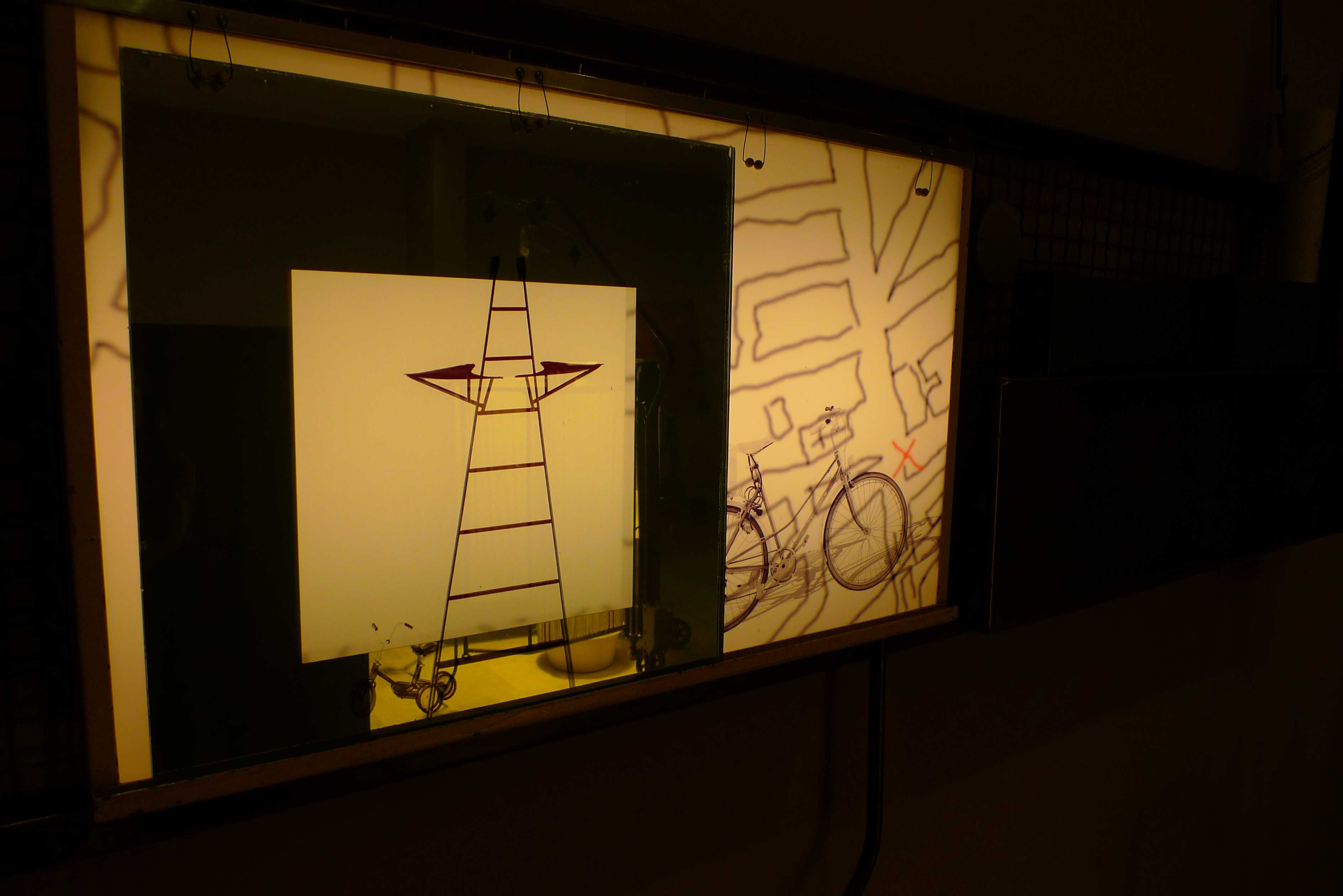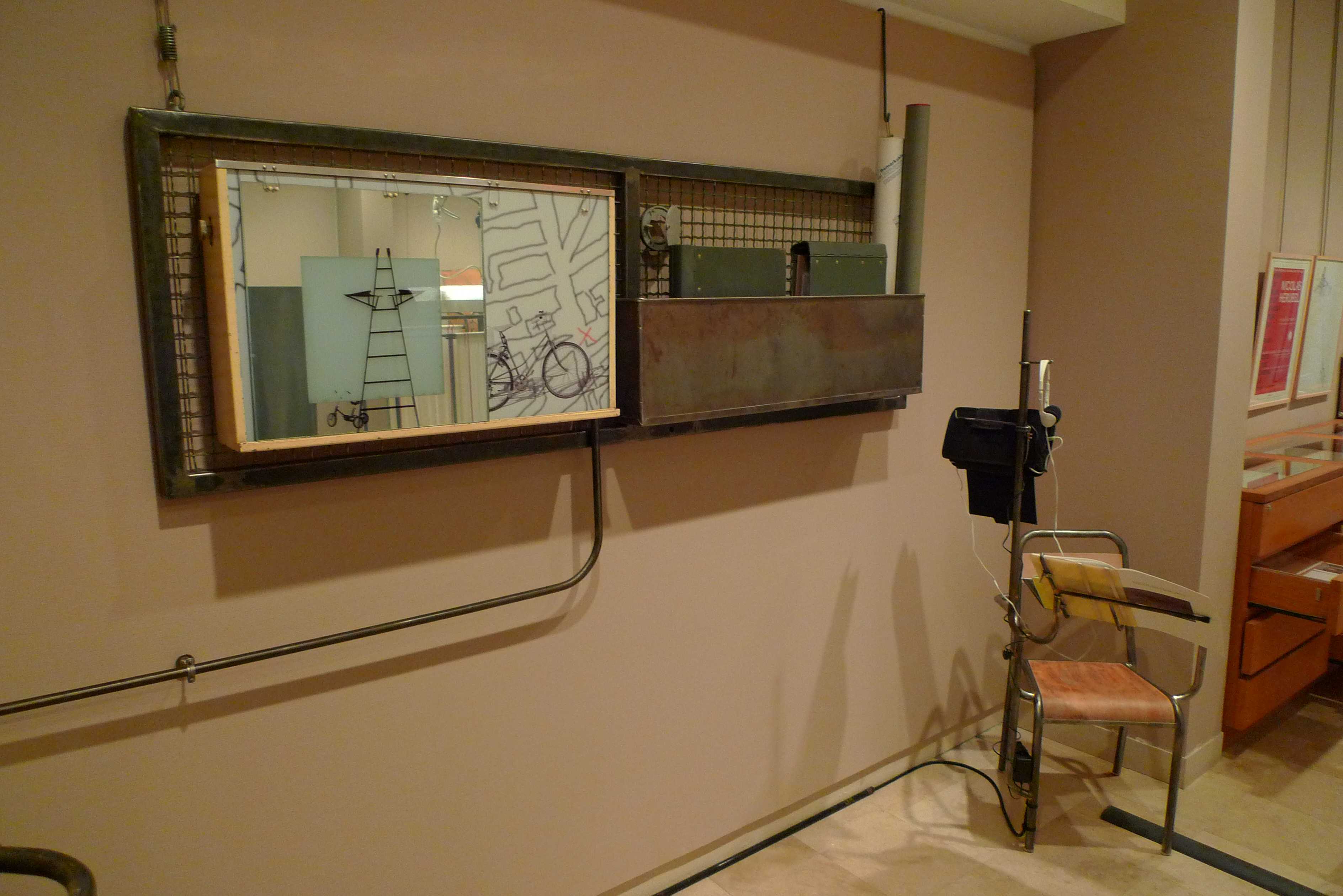 Châssis métallique grillagé, caisson lumineux, 3 classeurs d’archives , plans dans tube carton.