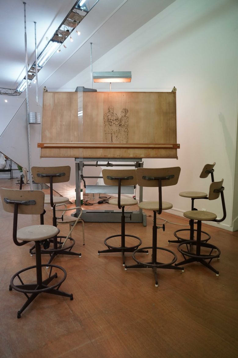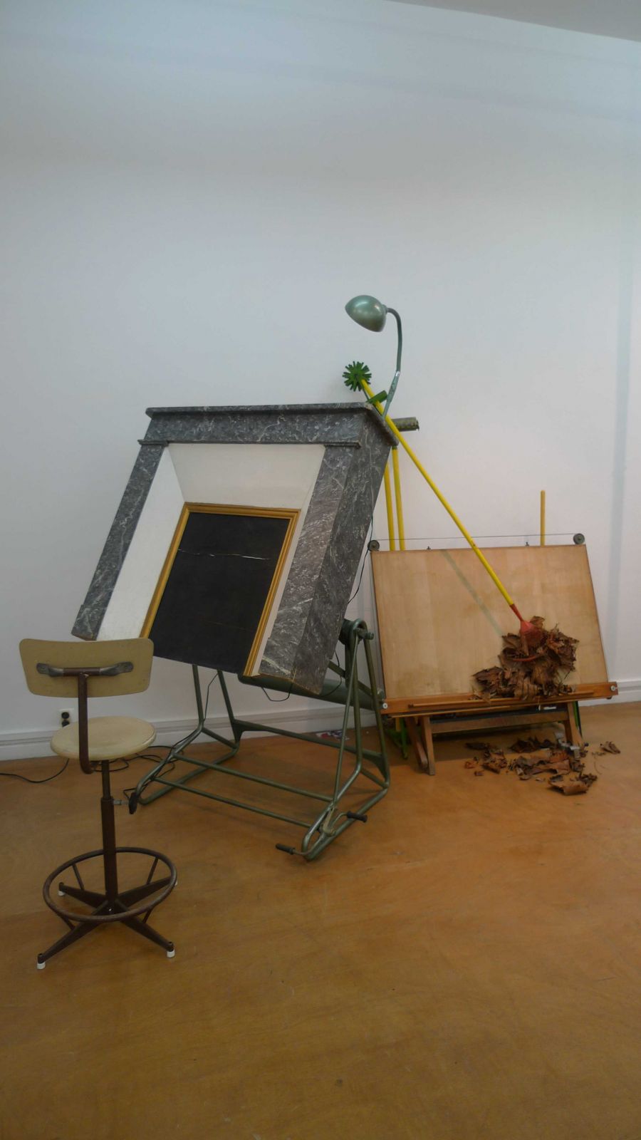 Table à dessin d'architecte, chaise, lampe sur flexible, manteau de cheminée factice en bois peint imitation marbre