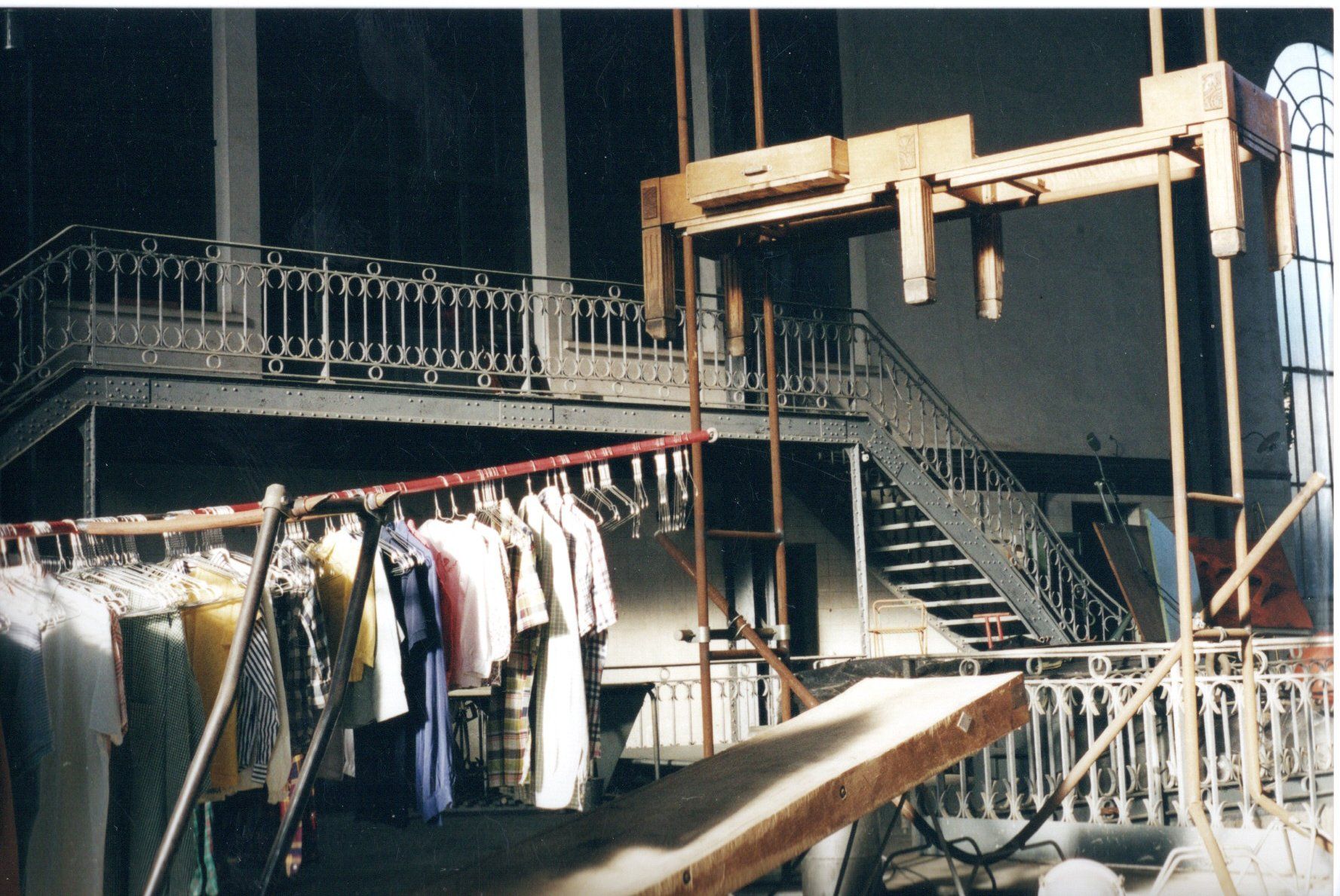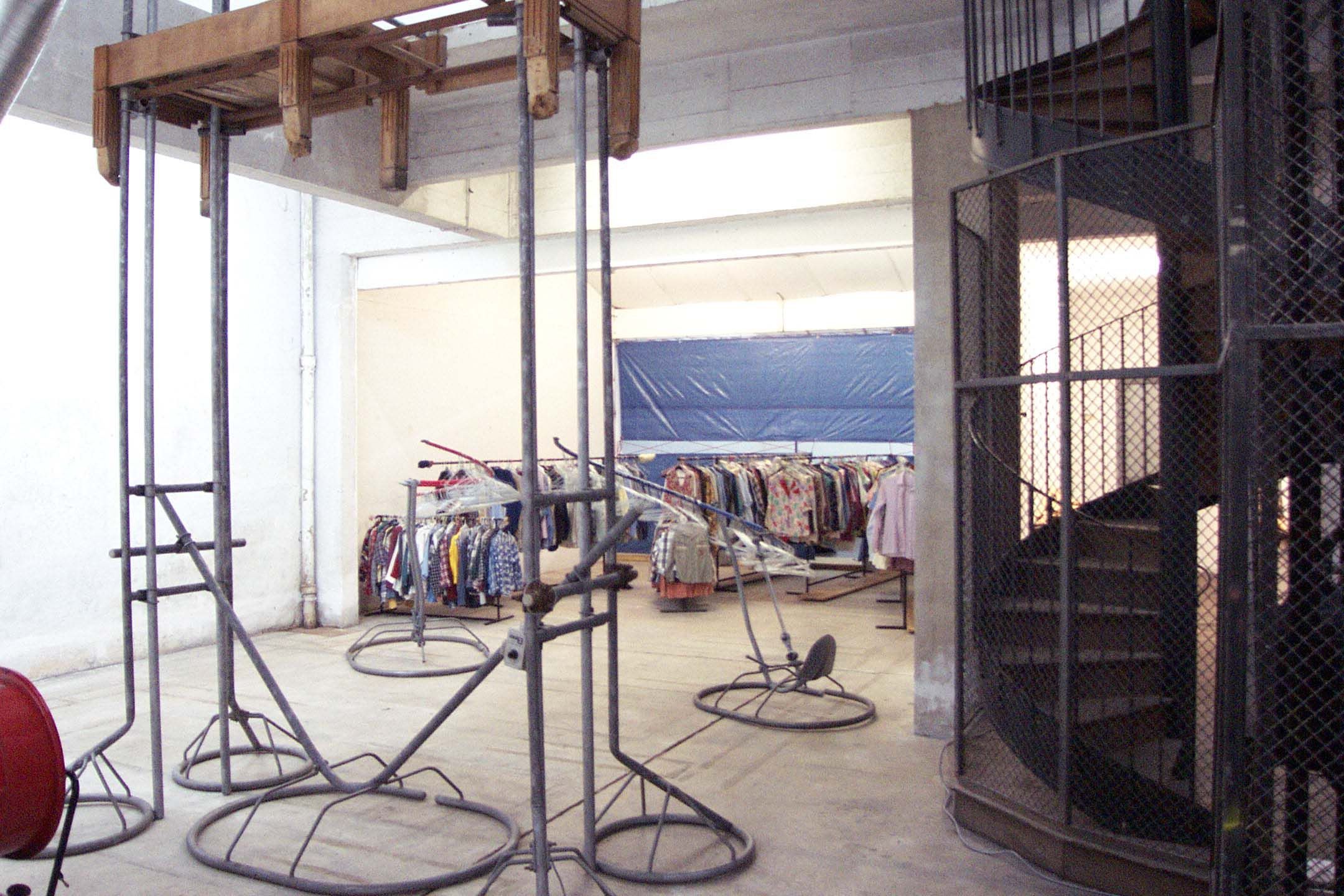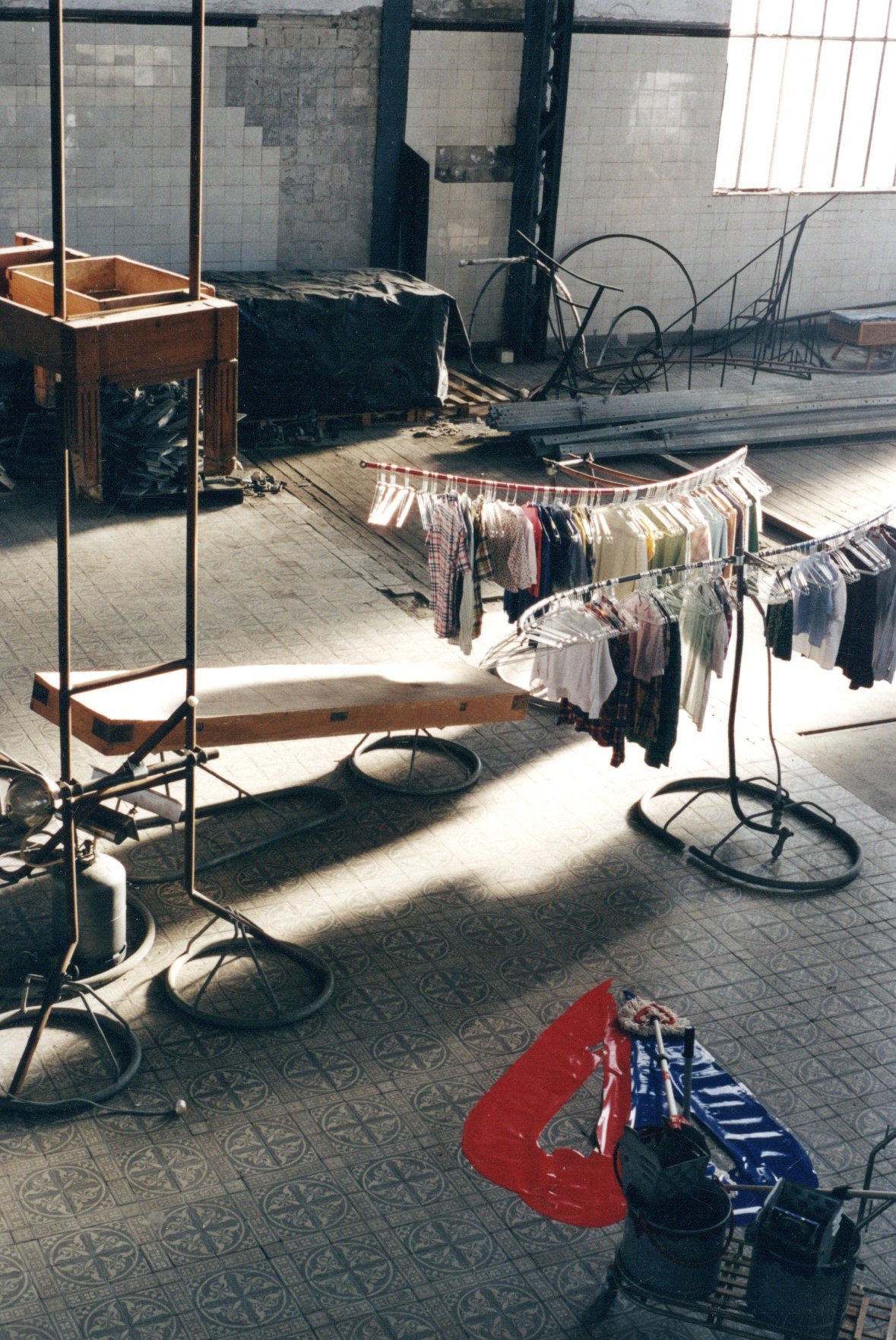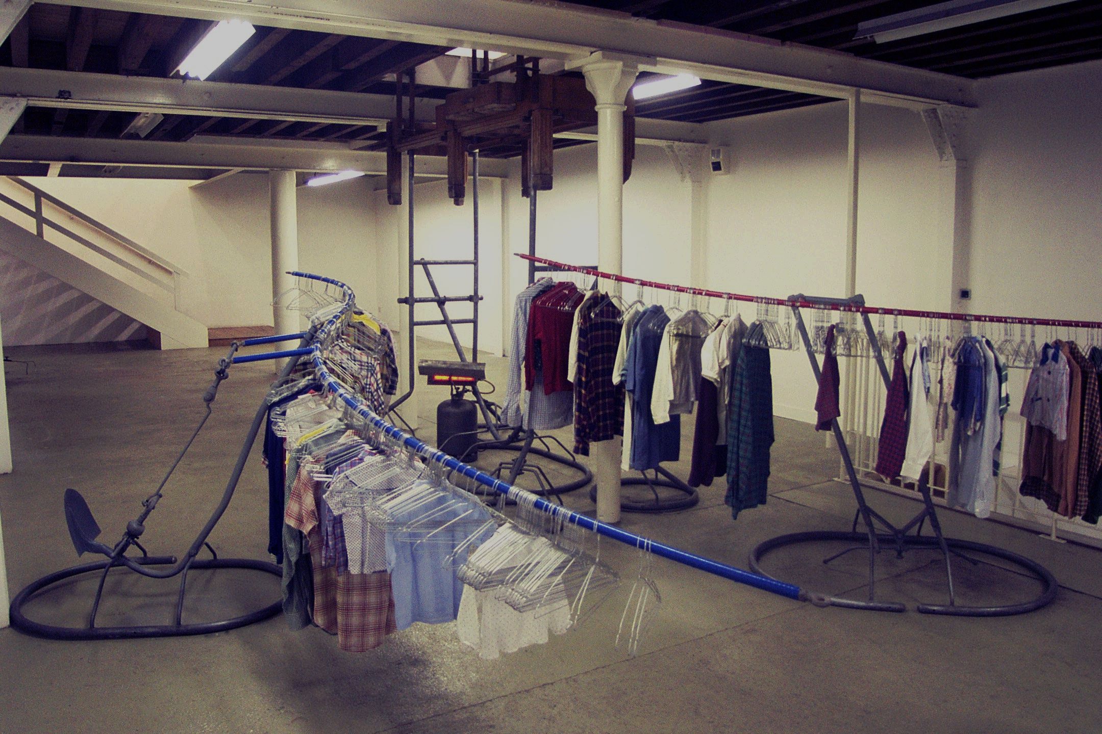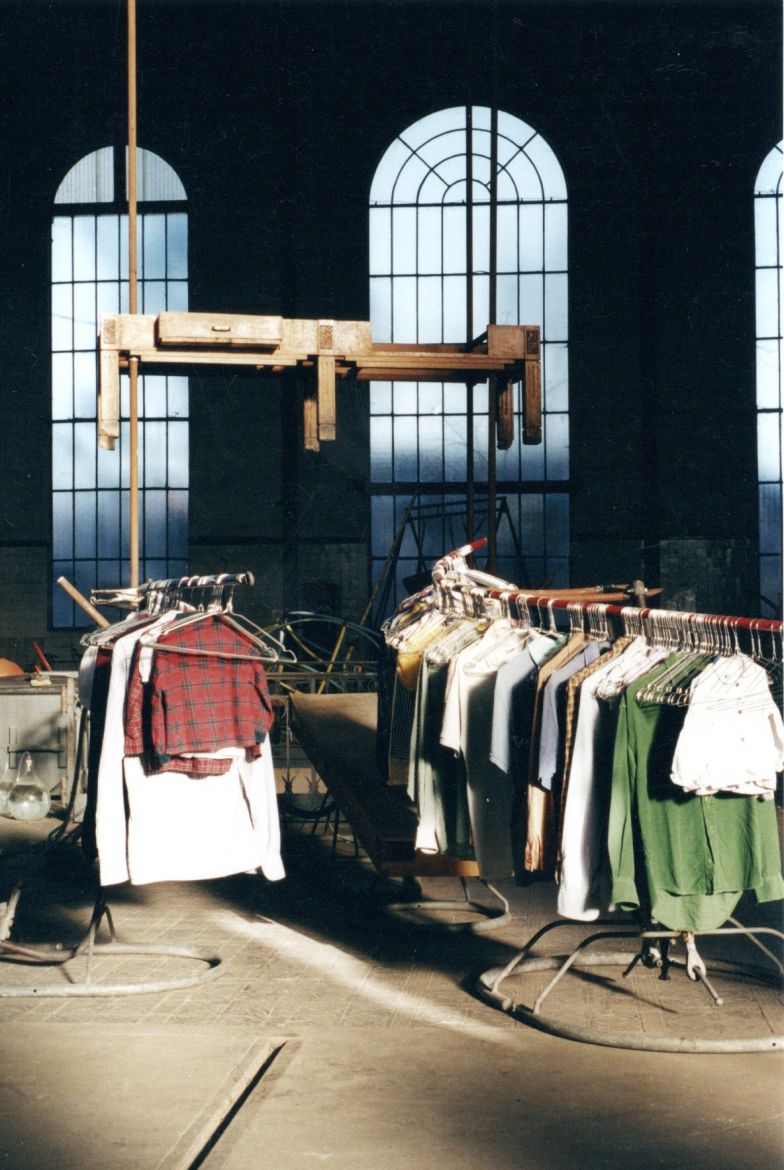 Des structures pouvant osciller supportent les chemises de tout un chacun. Elles offrent un couloir dans le tintement des cintres. L'agencement des structures : la musculature, les nervures de sang ou d'influx, le squelette compose les mécanismes. La matière est réduite à des agencements. L'homme est ce qui s'ajoute à ces mécanismes par l'intermédiaire de son habit, de ses odeurs. Les forces font un aller-retour - le sang-artères bleues et rouges dans un va et vient . Exodes anciens et plus récents aux portes de l'Europe. Un gué, une oblique /passerelle surgit entre deux mondes. La structure/squelette cette fois s'élève. Autel, croix mais aussi instrument de mort confèrent le concept théologique.
