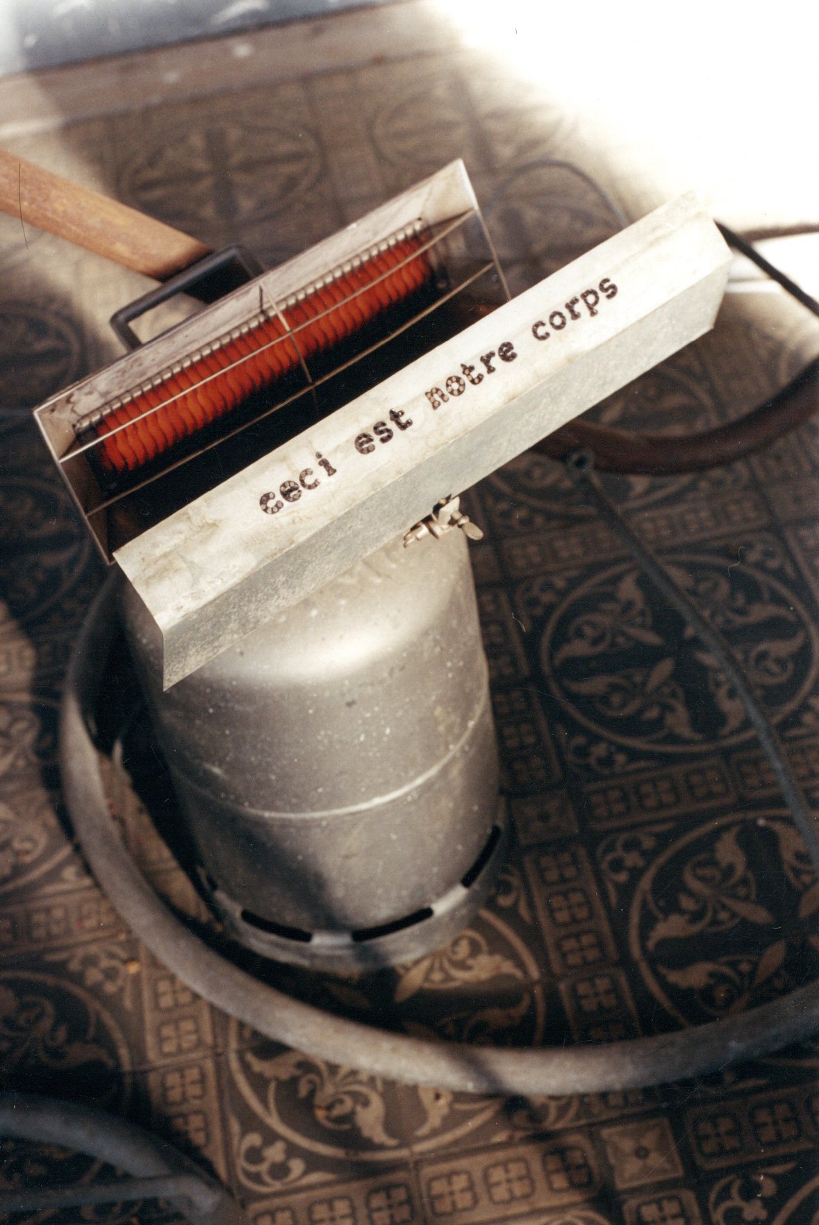 Échafaudage tube galvanisé, billot de boucher en bois, deux portants galvanisés avec cintres et chemises, bouteille de gaz avec rampe de chauffage portant l'inscription : ceci est notre corps ; chariot pour technicien de surfaces avec deux balais type Océdar ; deux découpes en zinc avec adhésif rouge et bleu.
