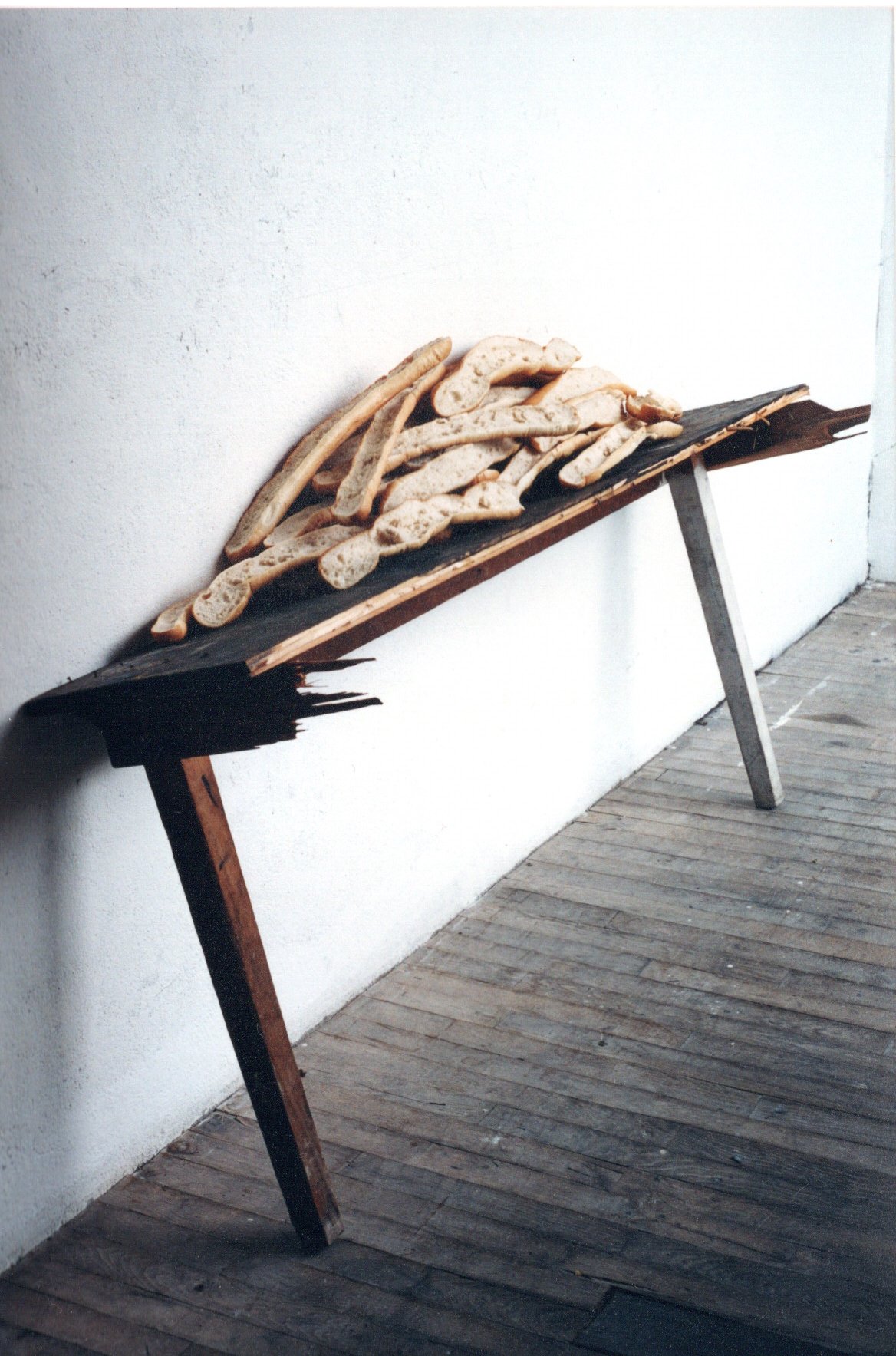 Installation composée d’une table coupée en deux et d’un nombre variable de baguettes de pain tranchée longitudinalement en deux