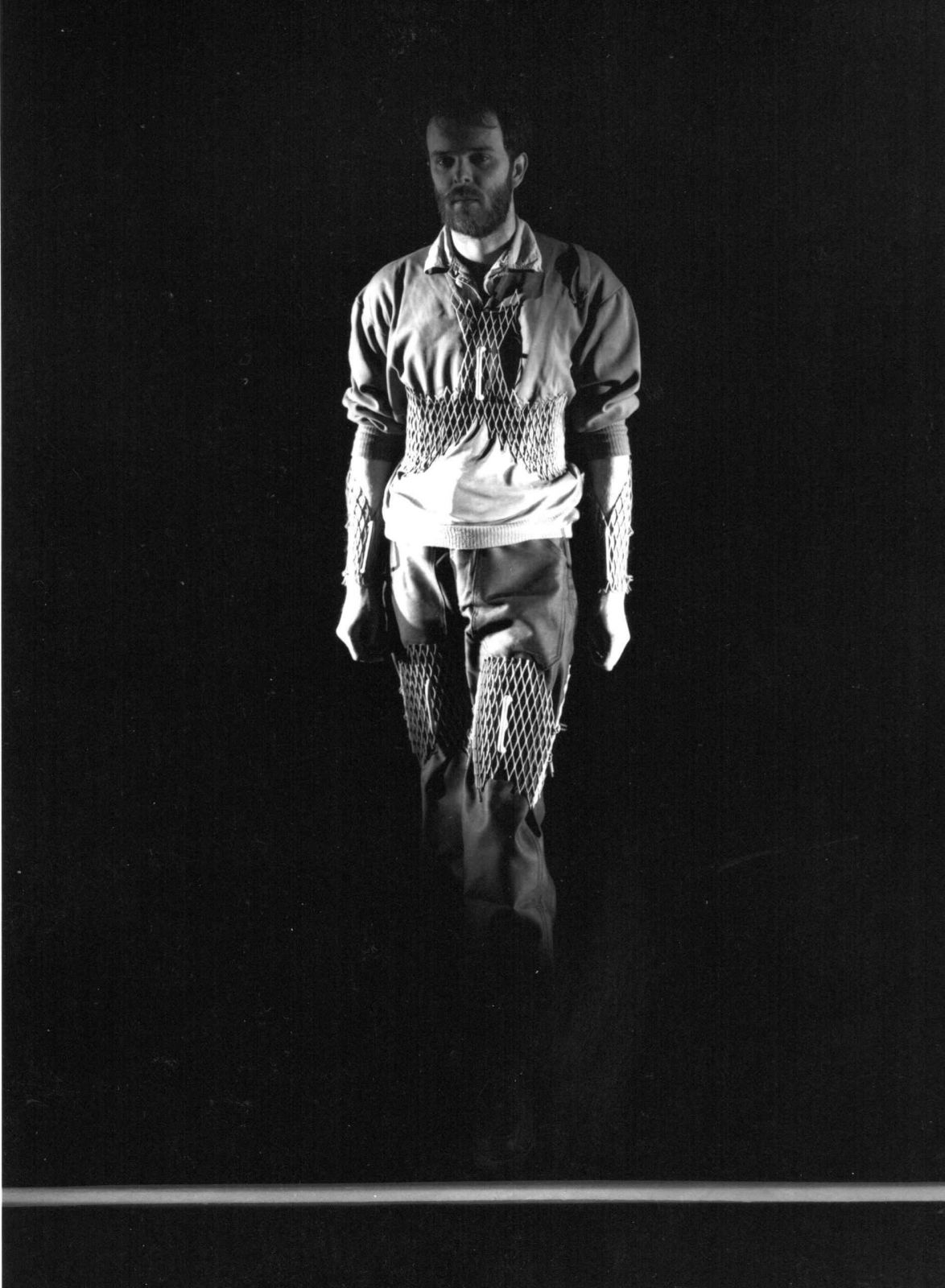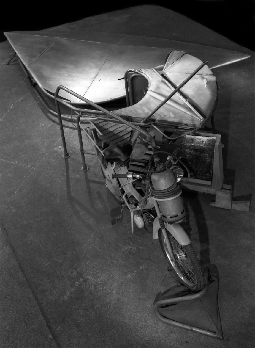 cela ne l'empêche pas de rêver parfois à une confrontation dérisoire et parodique avec la technologie quand il dit de sa Machine à Scier qu'elle « lui réserve l'ultime espoir de fournir un travail compétitif avec celui d'une machine-outil ». ses « Machines sont ambivalentes, elles prolongent et soutiennent autant qu'elles contraignent. Ce sont des formes qui pour être au plus prêt du corps l'assujettissent. Mais la méticulosité quasi anthropométrique avec laquelle il se soumet aux exigences d'adéquation entre son corps, la machine et le mouvement qu'elle formalise, va de pair avec l'usage singulier qu'il en fait : définir son identité, donner forme à une personnalité, cristalliser une énergie vitale qui se déploie dans l'espace et le temps.