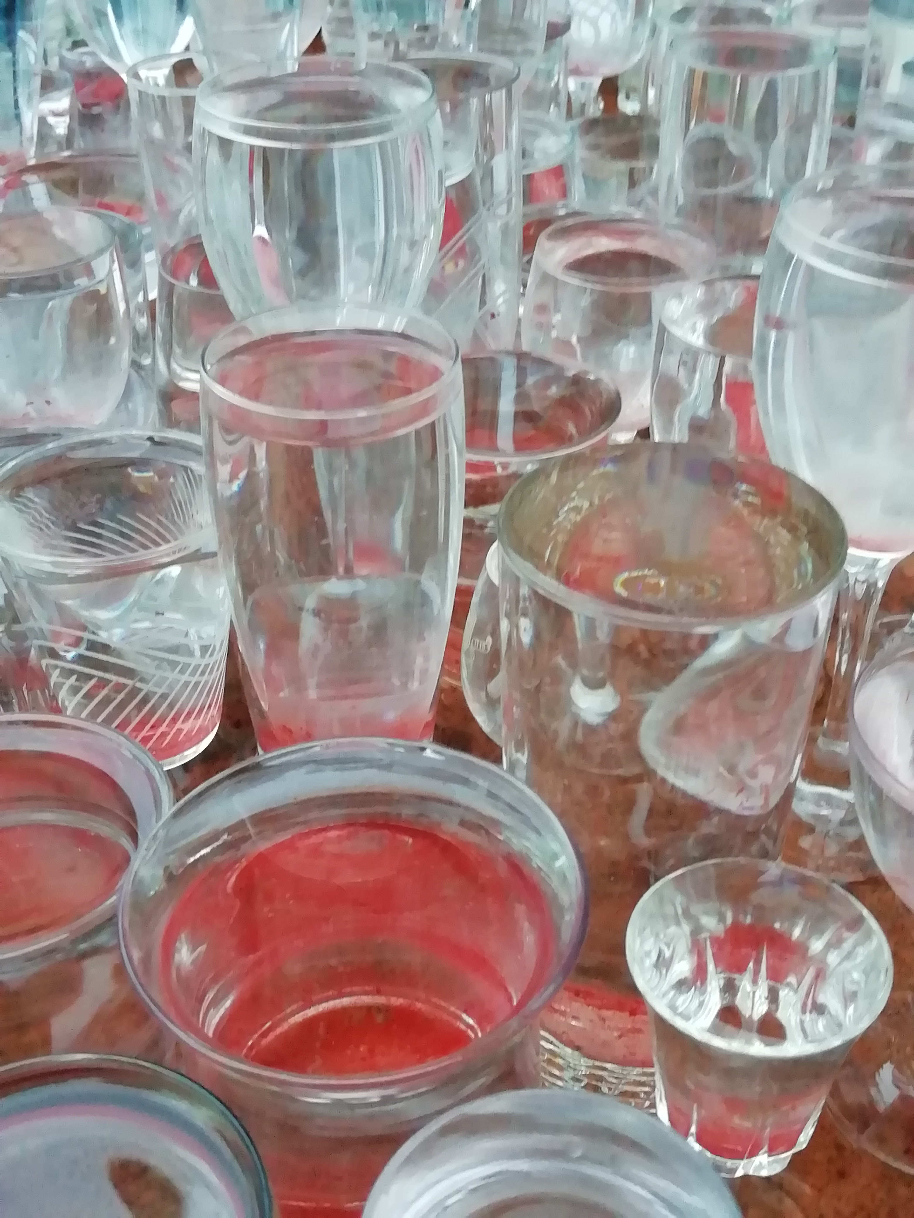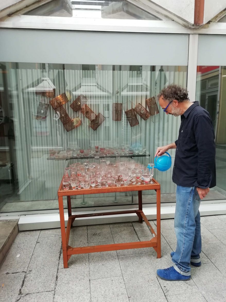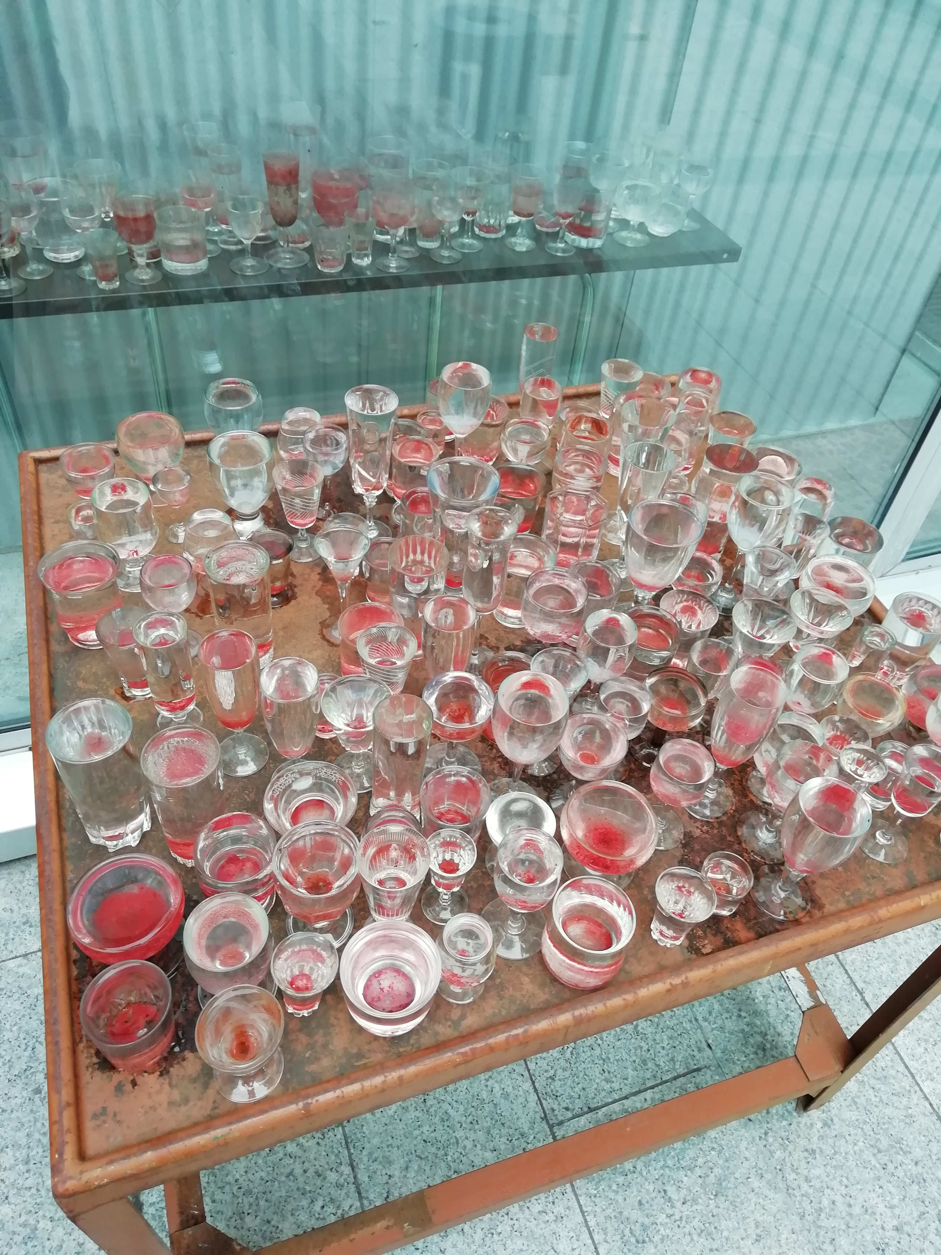 Tous semblables, tous différents, mai 2020, dans la cour d'Émmaüs, quand il pleut, les verres trinquent, le temps cristallise, Tchin !, 2020