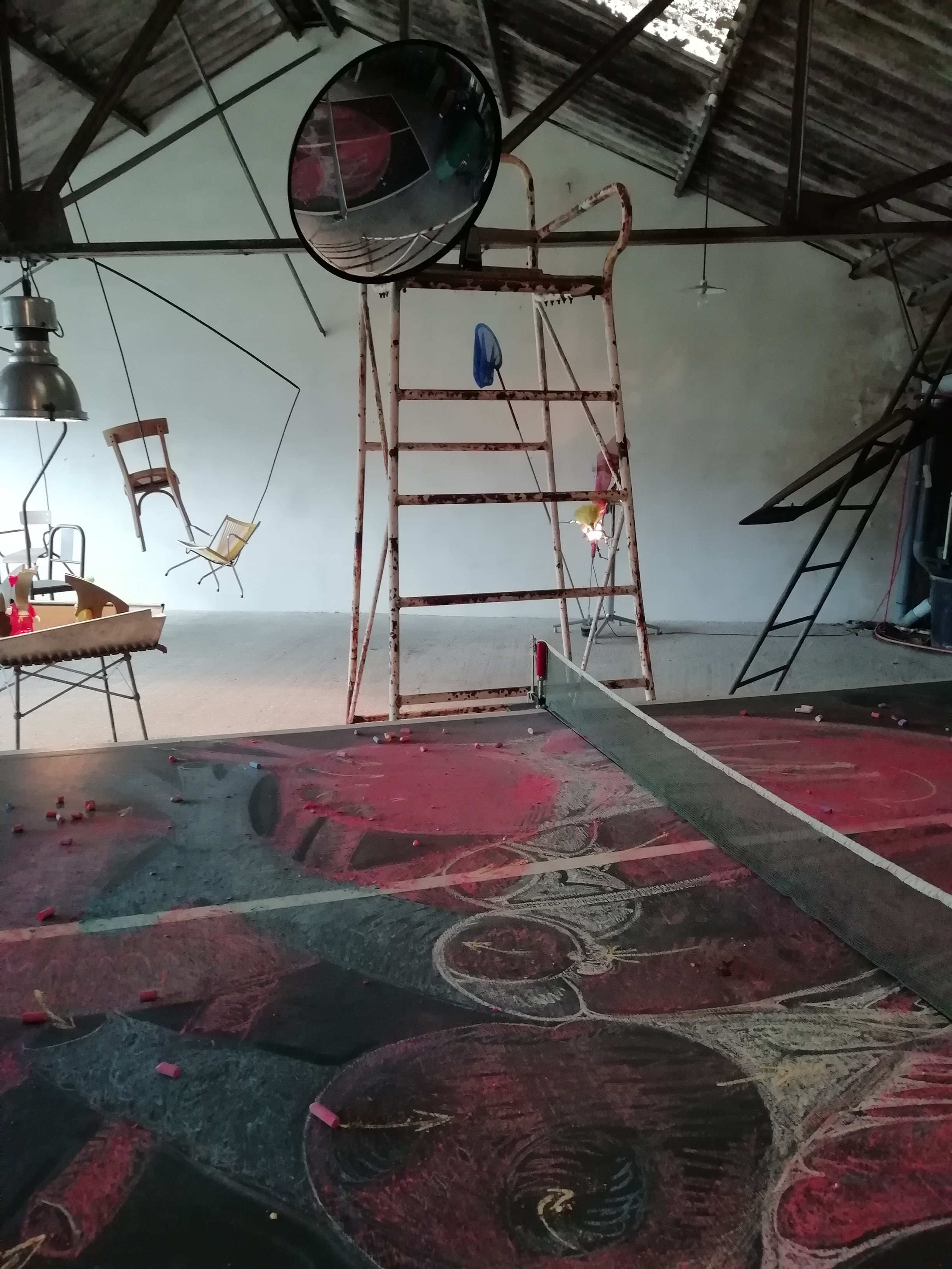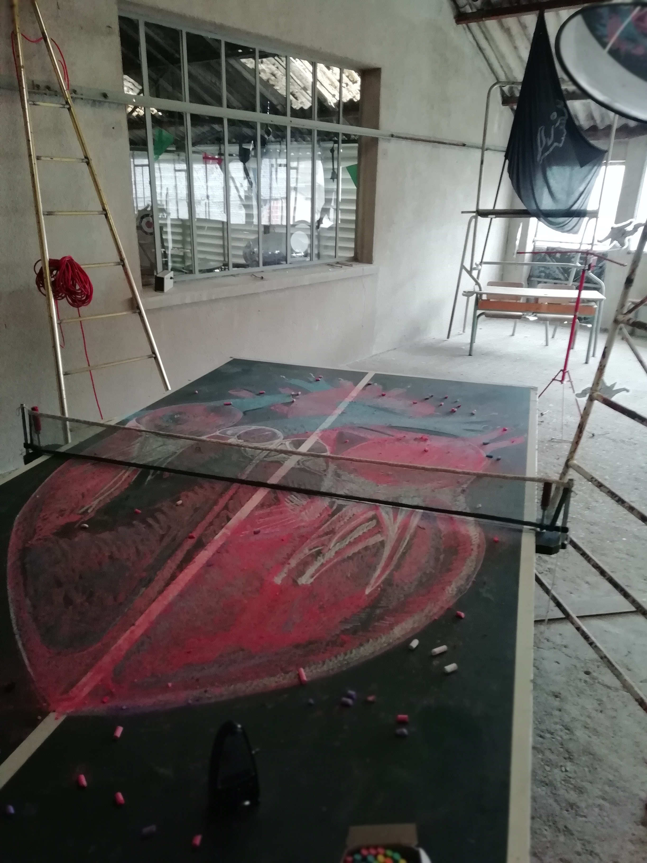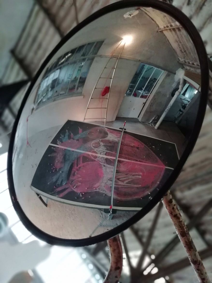 Installation : Table de ping-pong en bois avec dessin anatomique d'un cœur à la craie de couleur, filet, chaise d'arbitre bois et métal, miroir de surveillance, métronome,