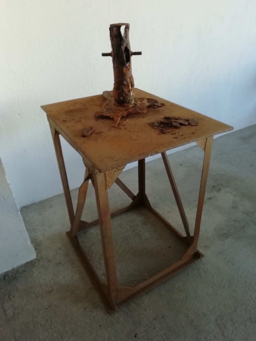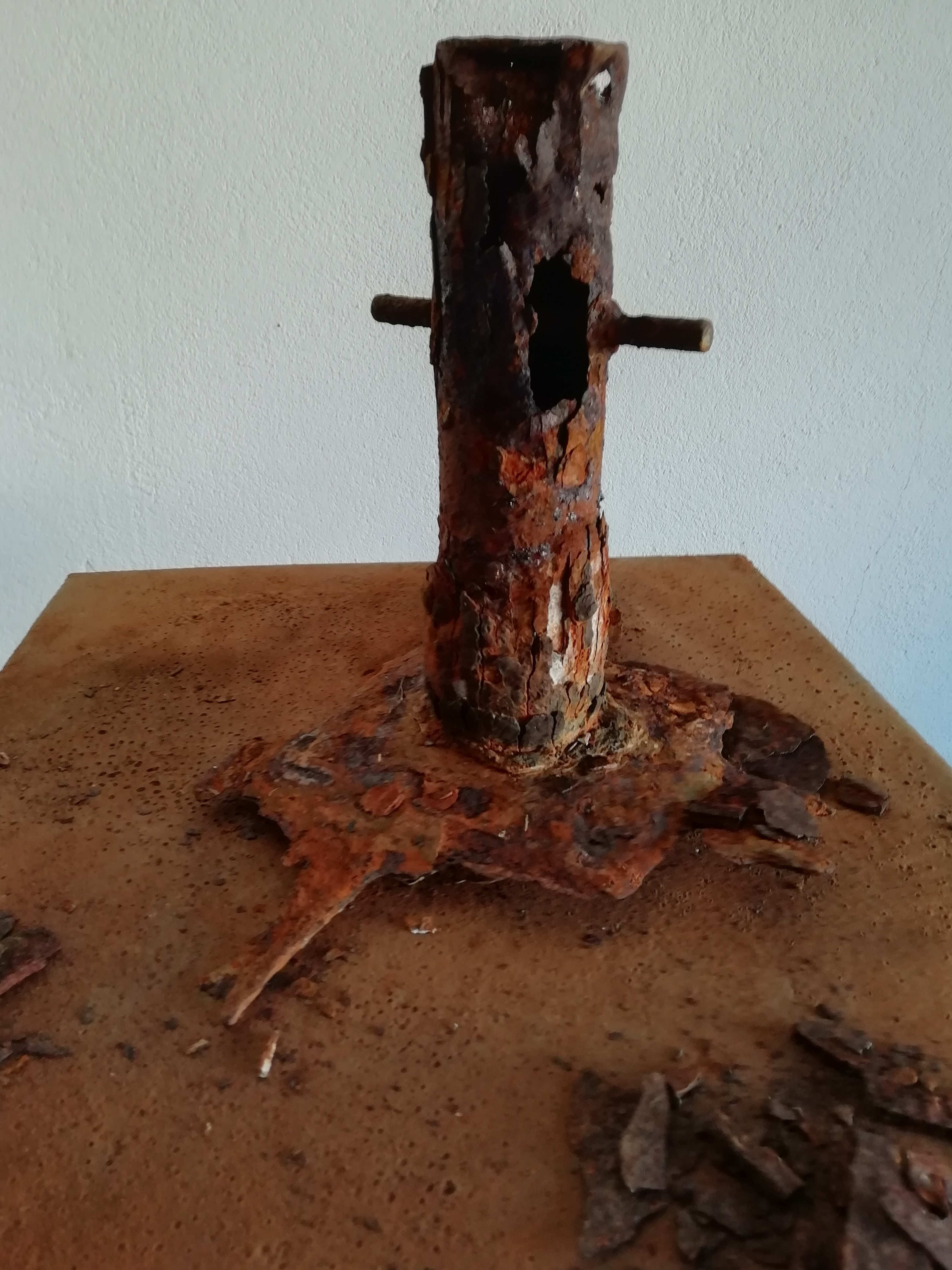 Installation : bâtie en cornière métallique, plaque de fonte, vestige de borne d'amarrage,fragments de rouille