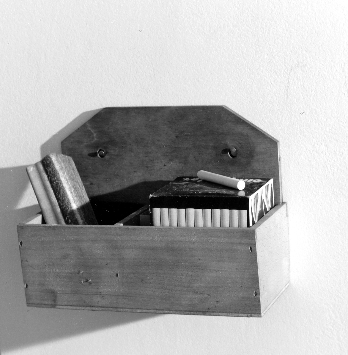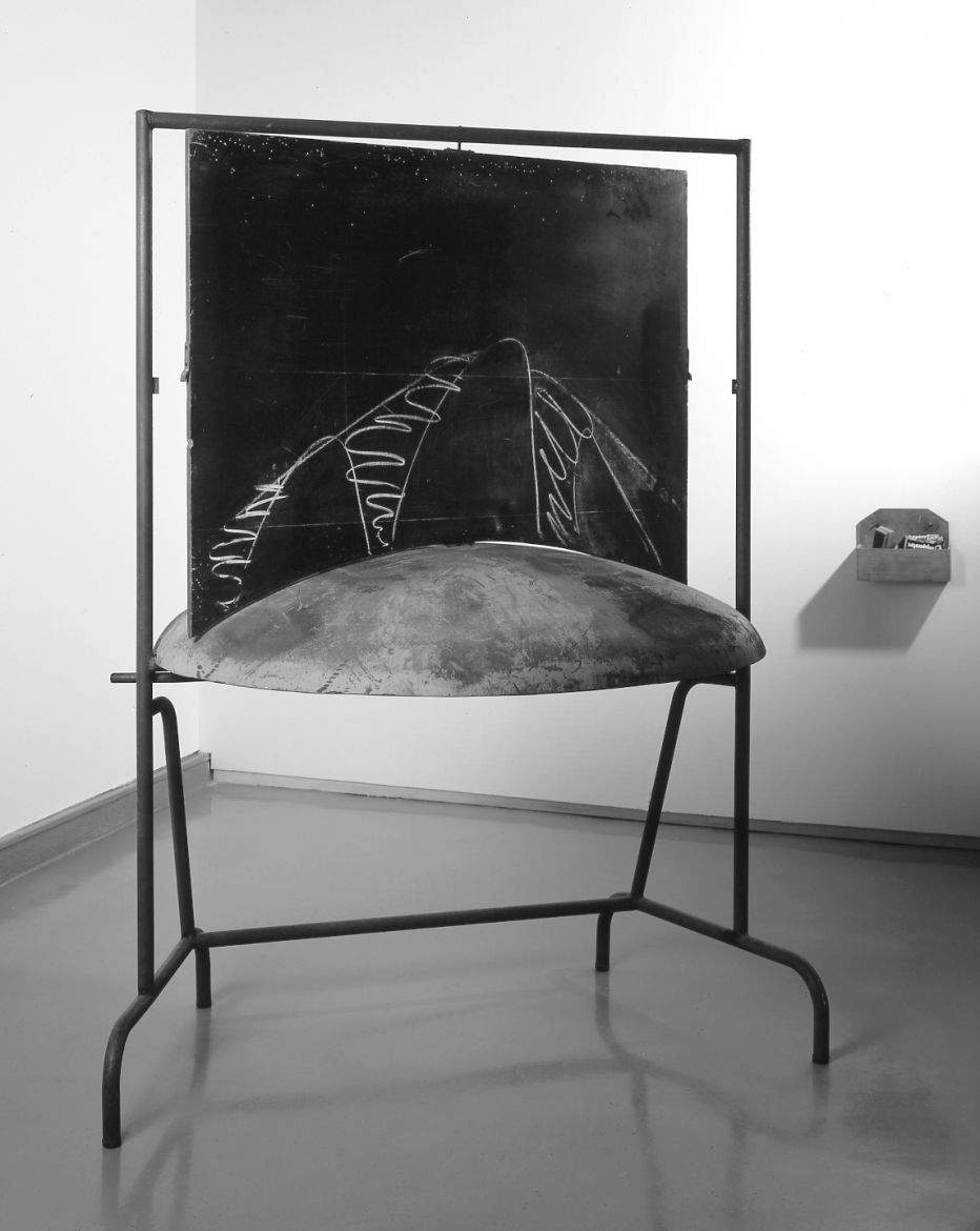Strcture acier, dessins sur tableau noir, fond de cuve acier, boite murale contenant craies et effaceur feutre