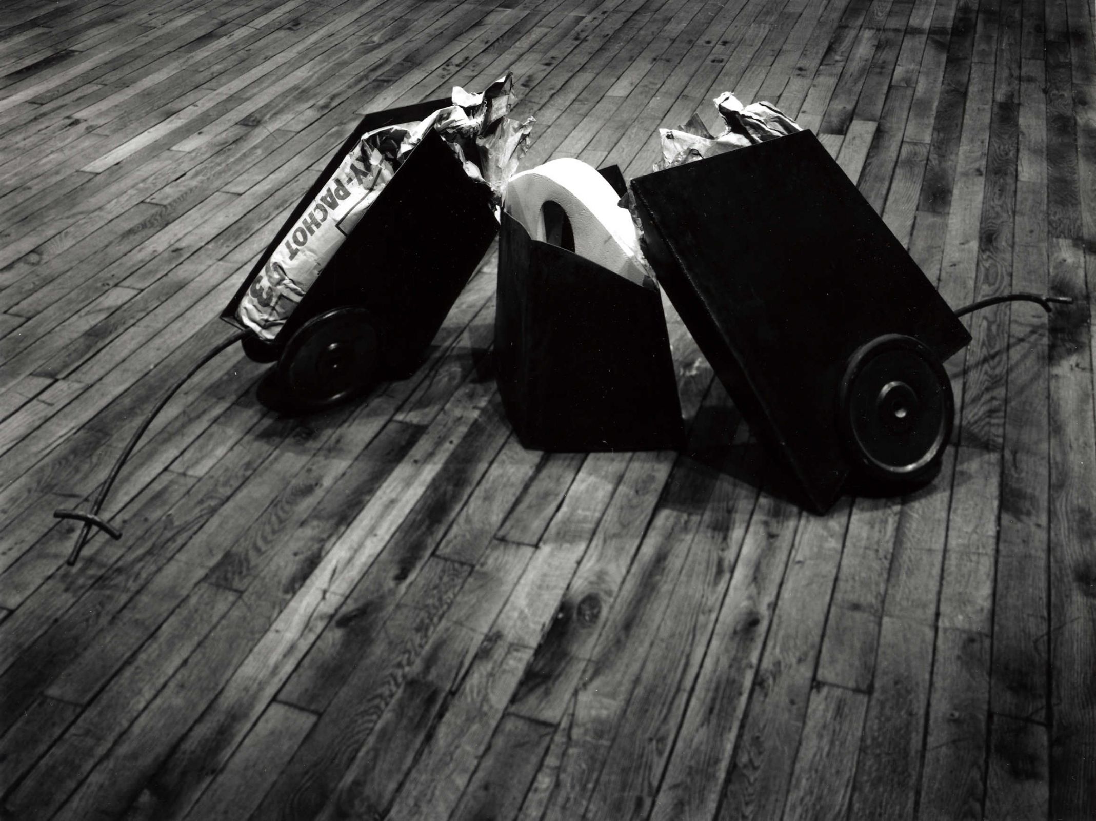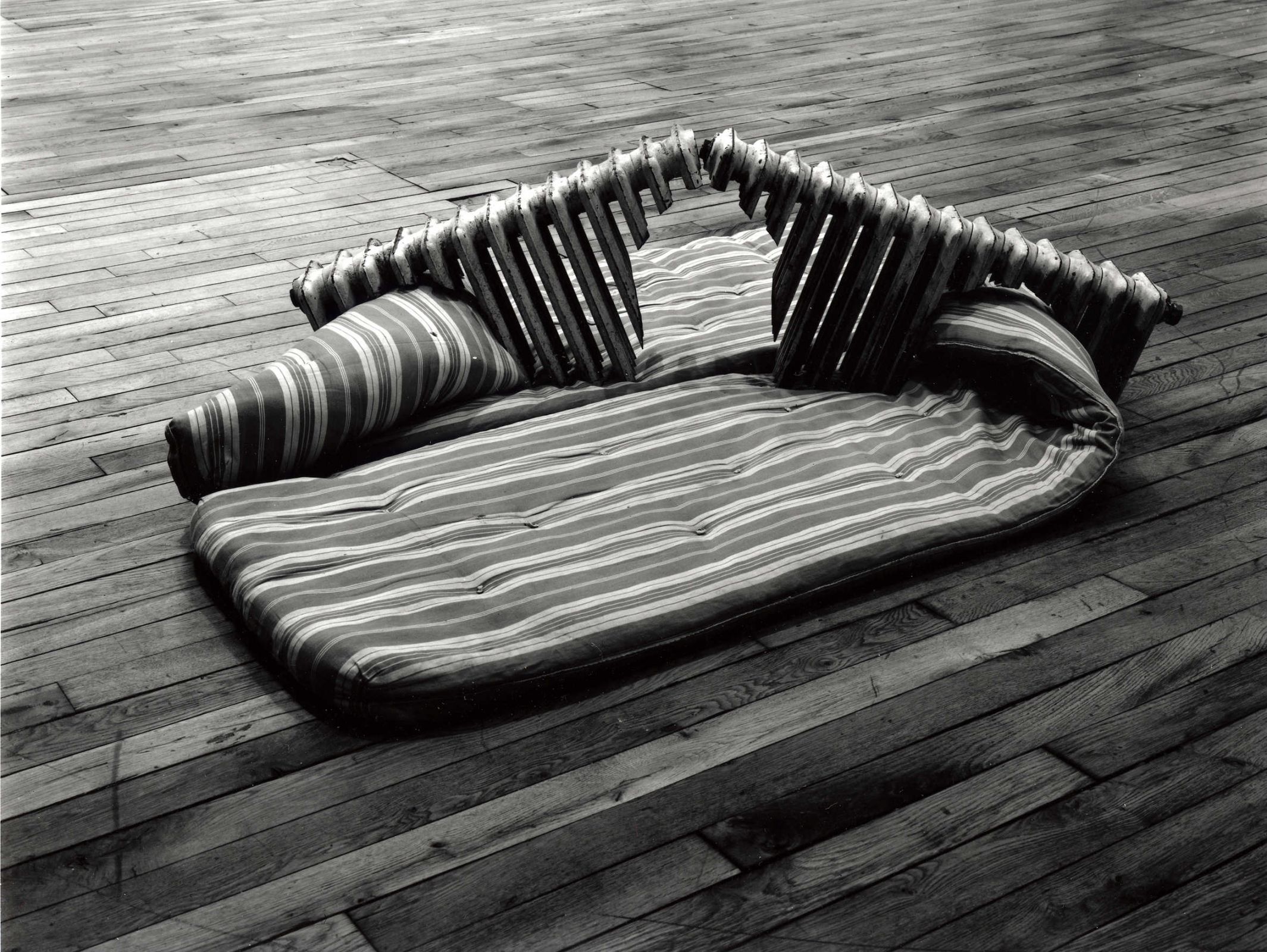 “Nicolas Hérubel crée des sculptures qui sont des démonstrations dans l’espace, des machines qui adhèrent au corps pour stimuler l’une de ses fonctions. C’est le principe des prothèses: Machines à marcher, Machines à scier, objets autobiographiques thermoformés (Panoplie), ou encore, à l’aide d’un cyclo Peugeot 103, l ‘ Unité cantonnière. Une deuxième forme de démonstration est réalisée par des assemblages d’acier laminé type main courante et de tôle larmée qui sont installés dans l’espace et qu’il nomme Tables d’orientation. Ce côté “pédagogique” fait place à une structuration plus détendue de l’espace dans les Dispositifs pour aboutir à des objets de plus en plus ludiques, poétiques et même teintés d’humour comme ce couple de radiateurs qui se cherchent sur un matelas pour Construire un pont, même la nuit.”.