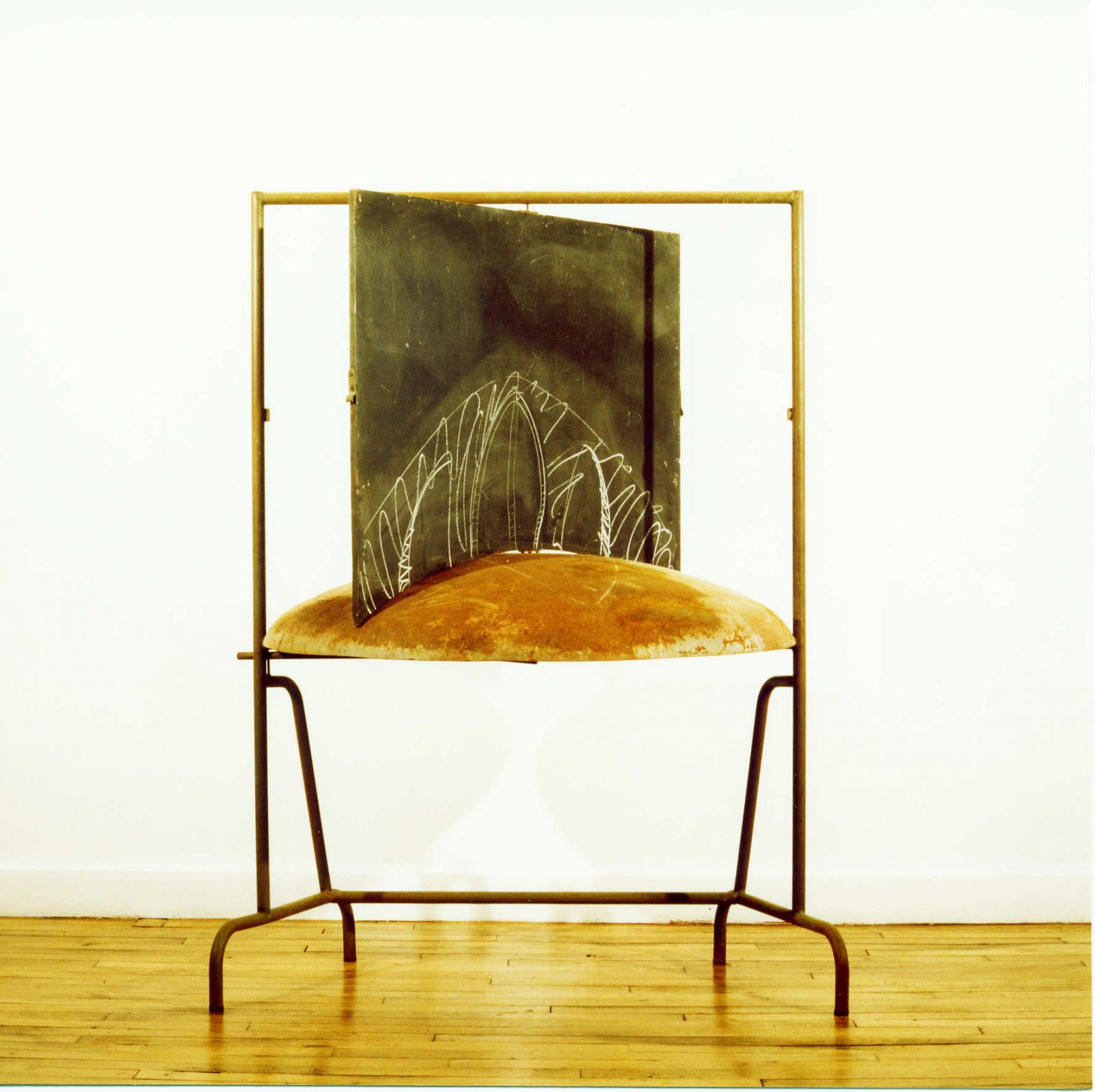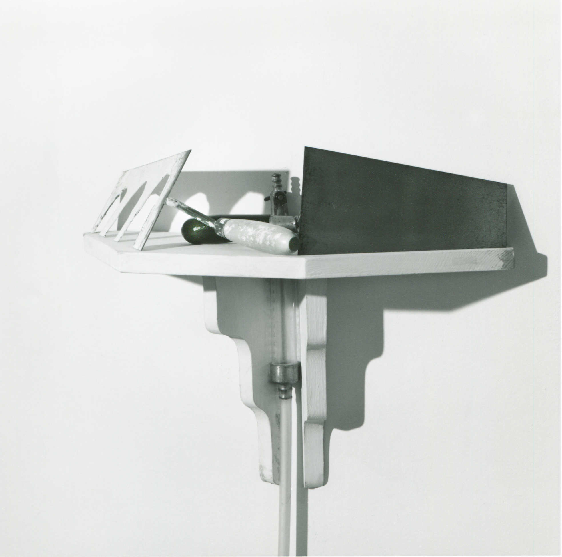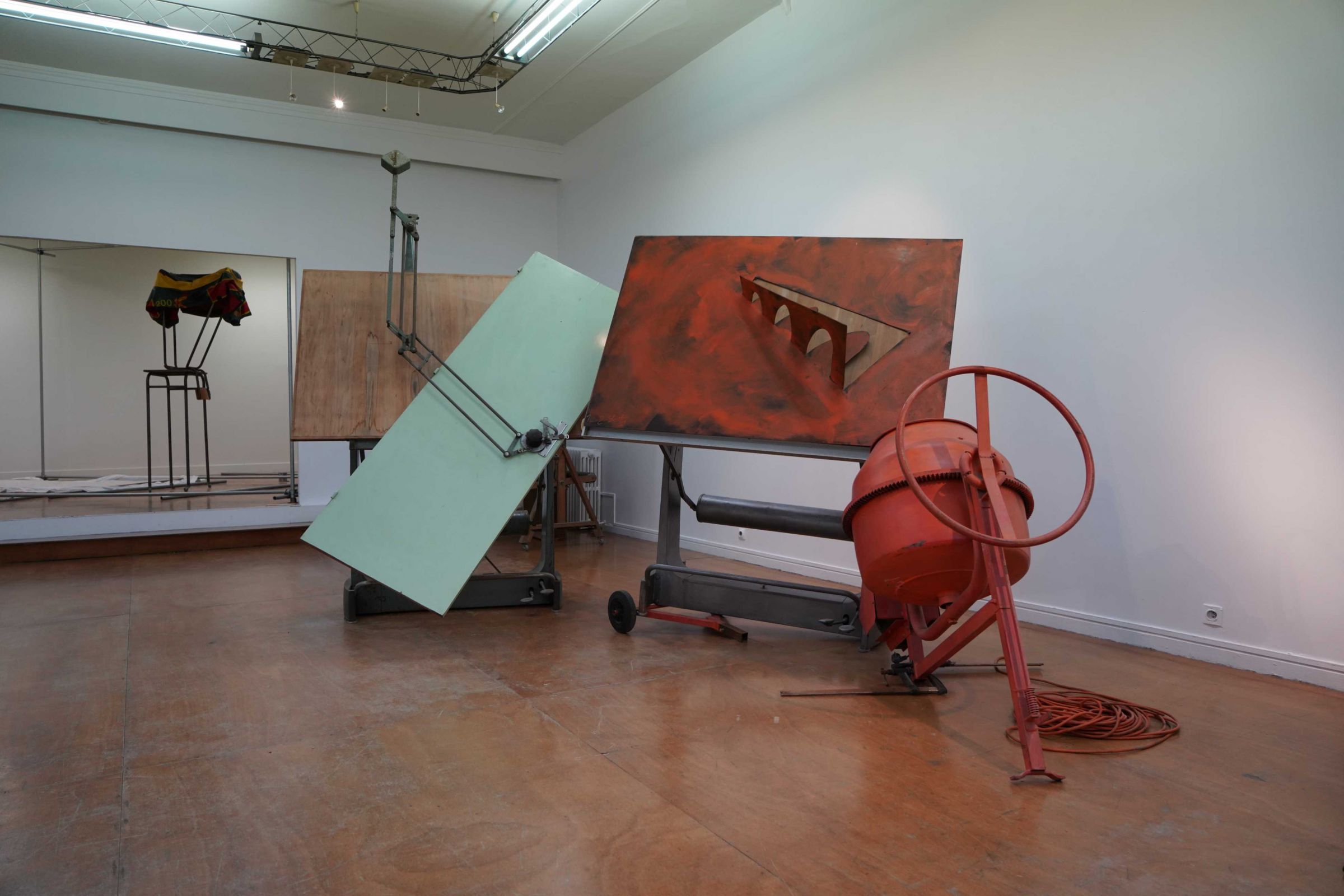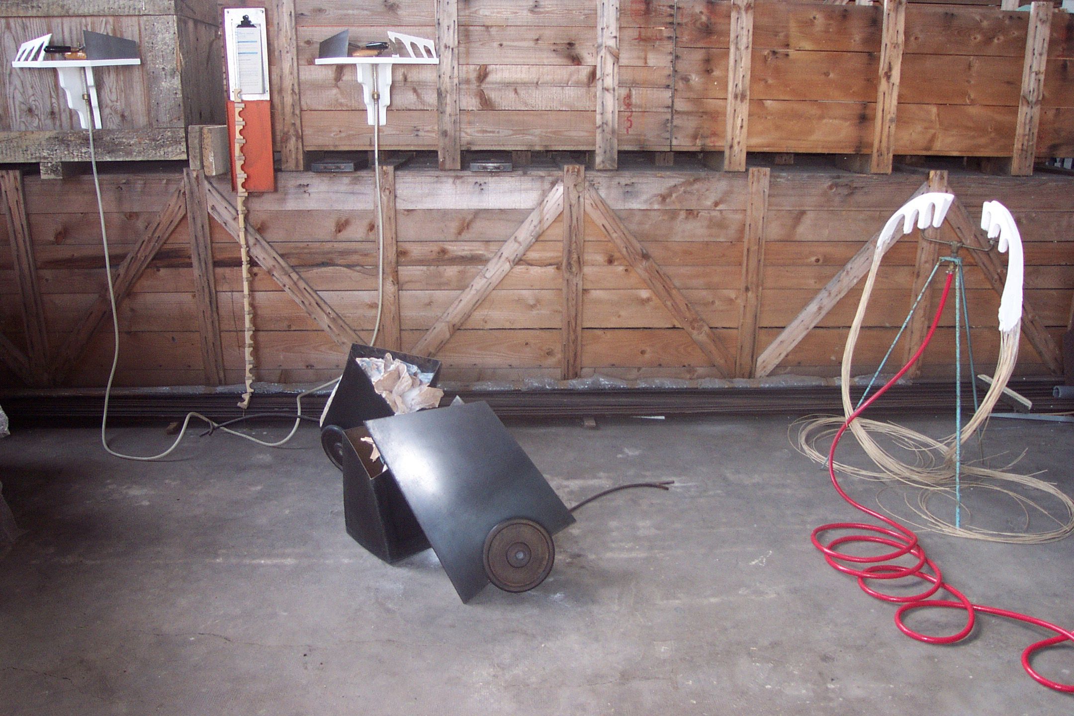 Version 1994 : table d’architecte, découpe acier et bétonnière table: H:1,80m; L:1,50m; l:0,80m, bétonnière: H:1,15m ; L:1,50m ; l: 0,90m
