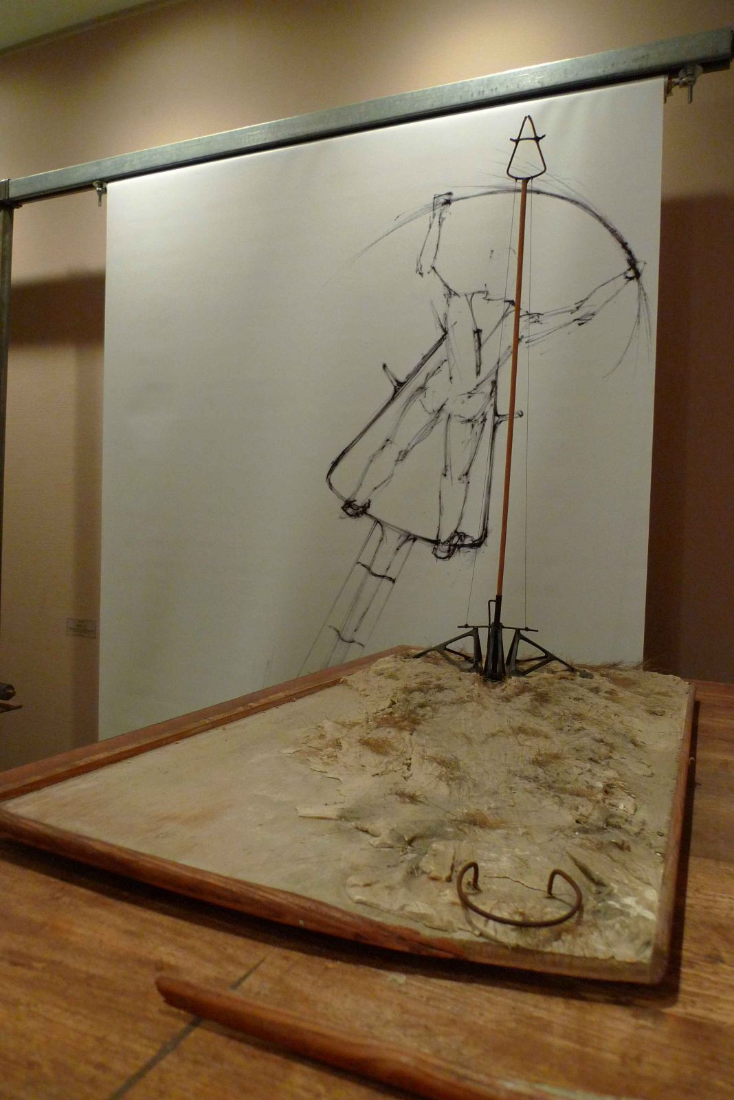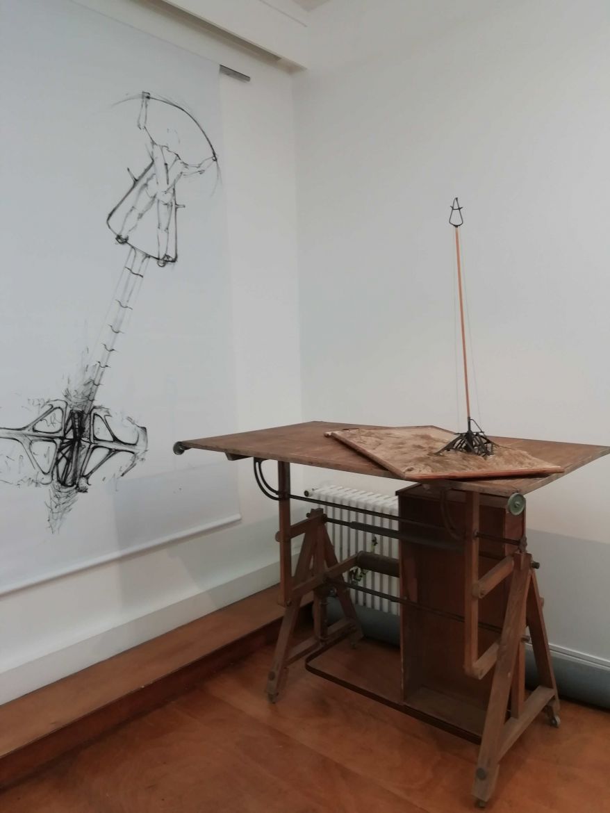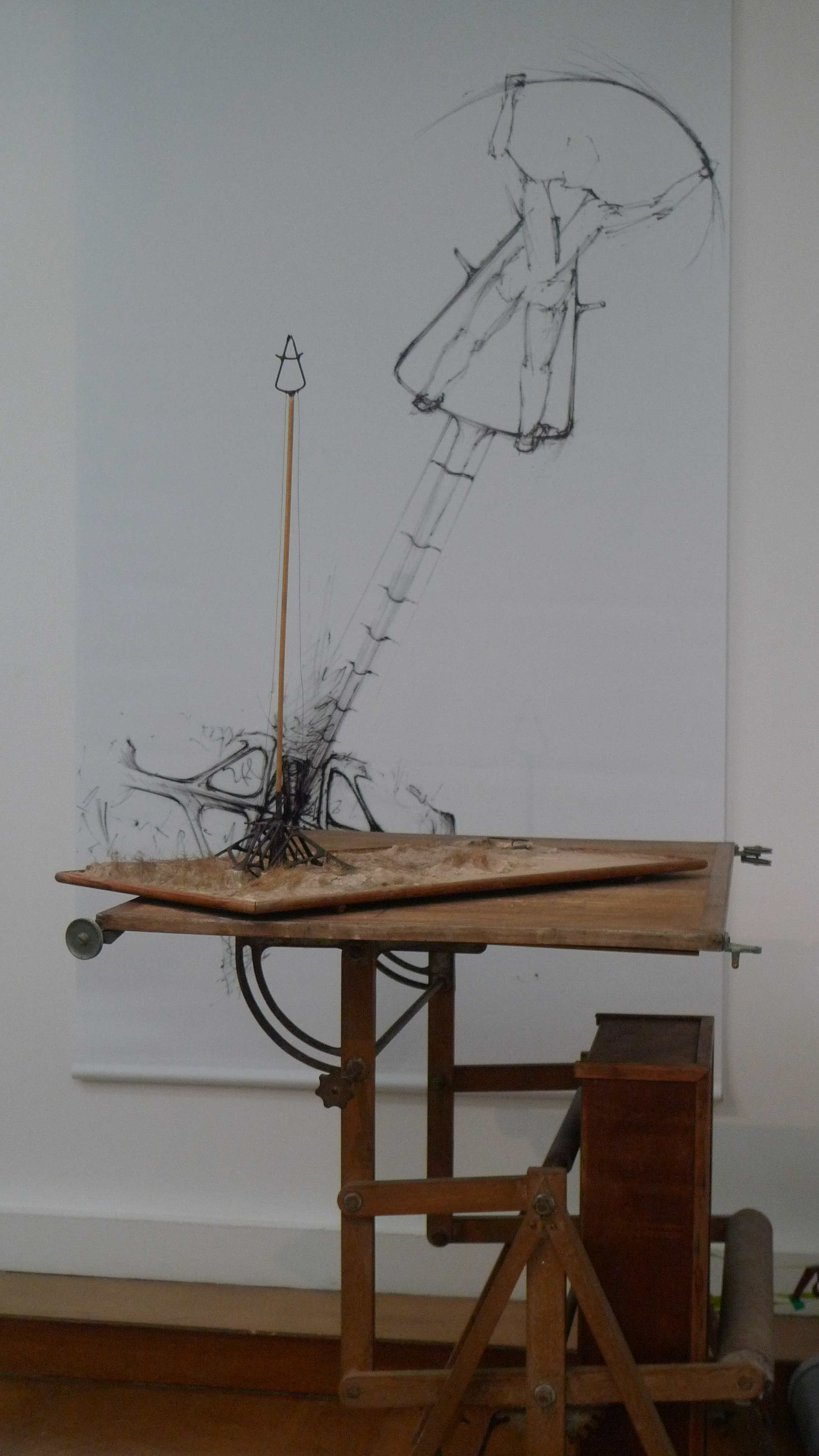 Installation composée d'une maquette, d'une table d'architecte, d'un carnet de dessins sur calque, d'un dessin imprimé sur bâche