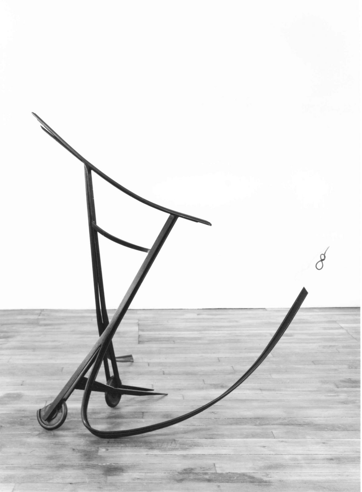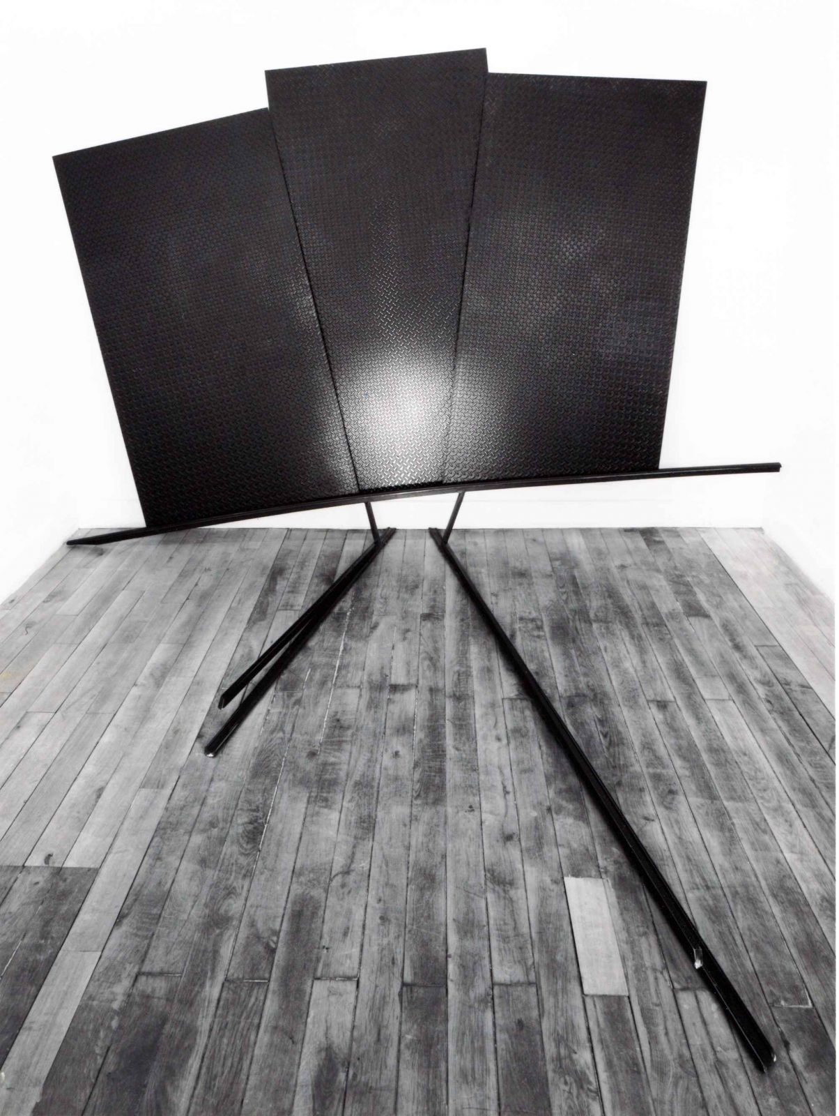 Deuxième œuvre proposée dans l'exposition, Table d'orientation n°6 reste fortement emprunté à l'univers industriel, la sculpture mêlant cette même réduction du vocabulaire formel, tôle larmée et acier, combinée à de grandes dimensions introspectives. La construction quasi architectonique de ces matériaux infléchit un mouvement, une dynamique, à la fois gracieuse dans un sens et disgracieuse dans l'autre, la trajectoire réalisée devient celle de l'élévation, de l'envol puis celle de la chute.