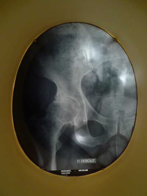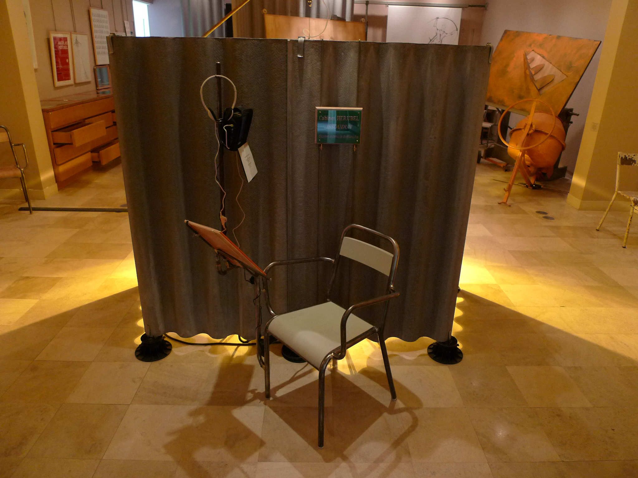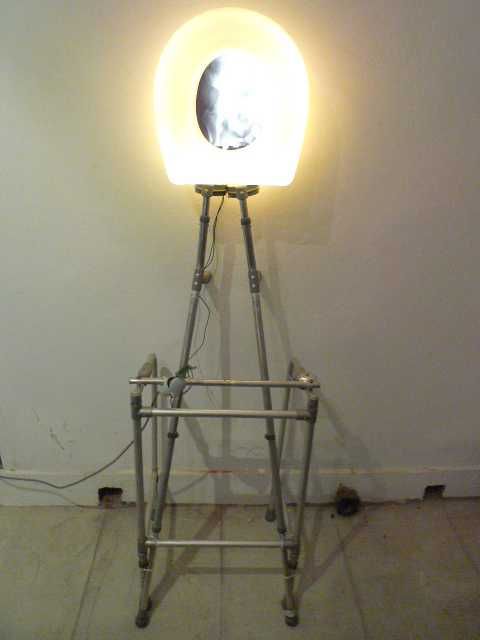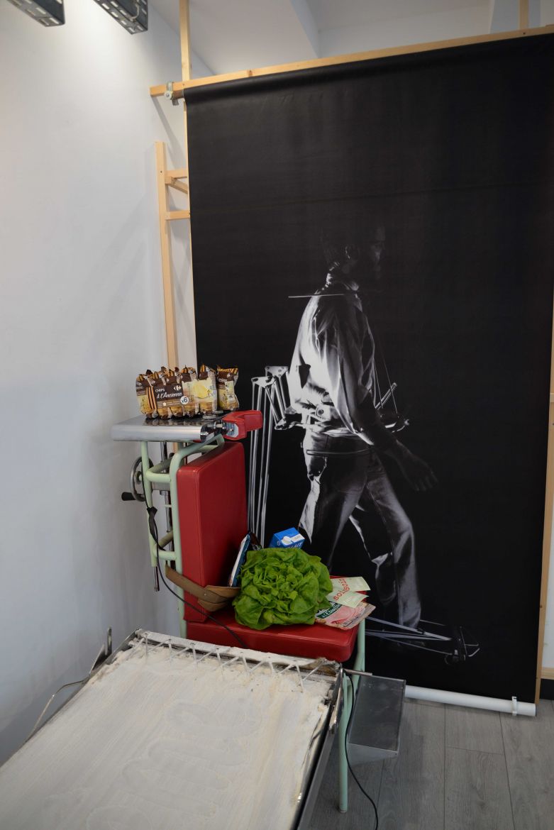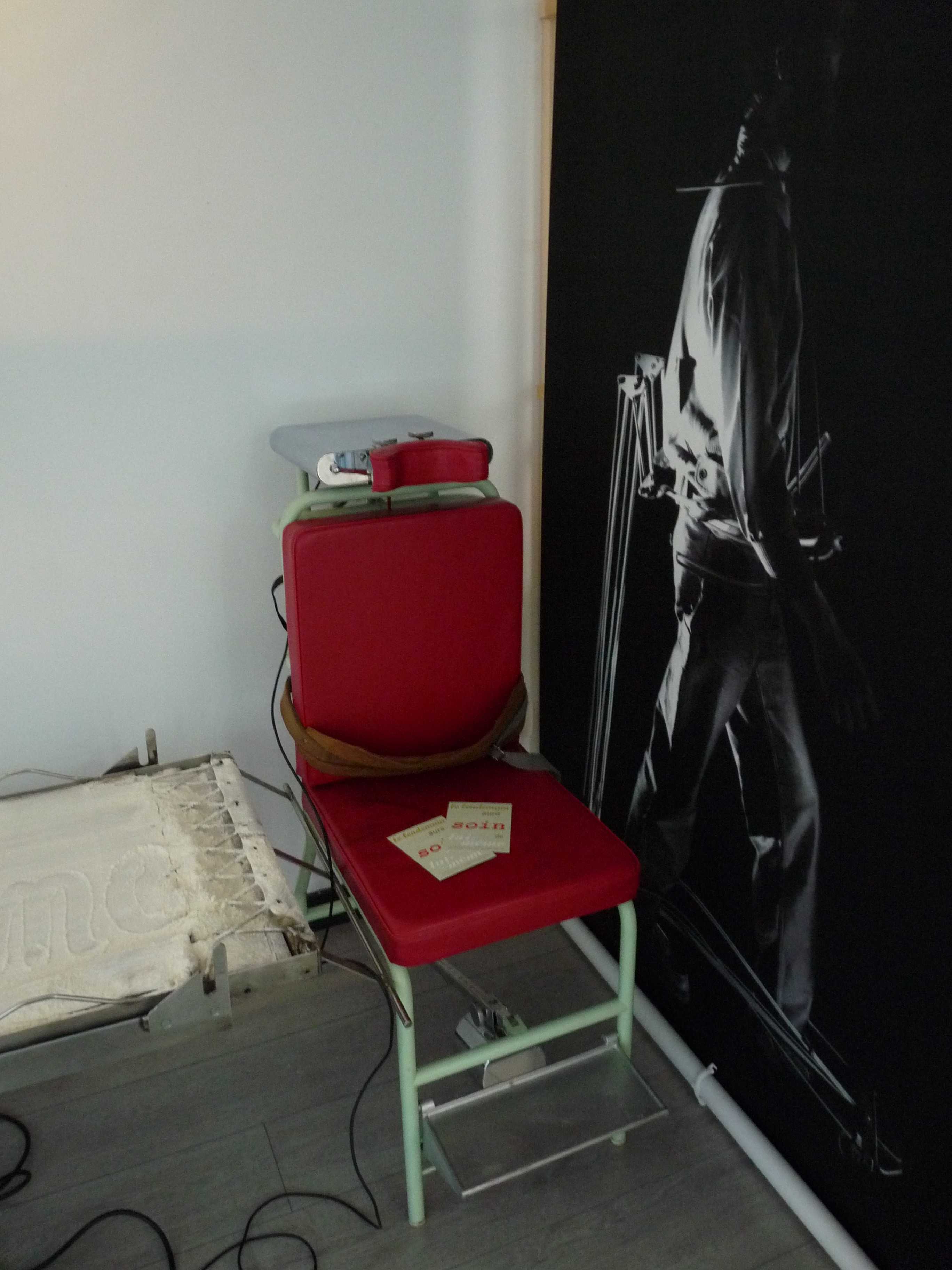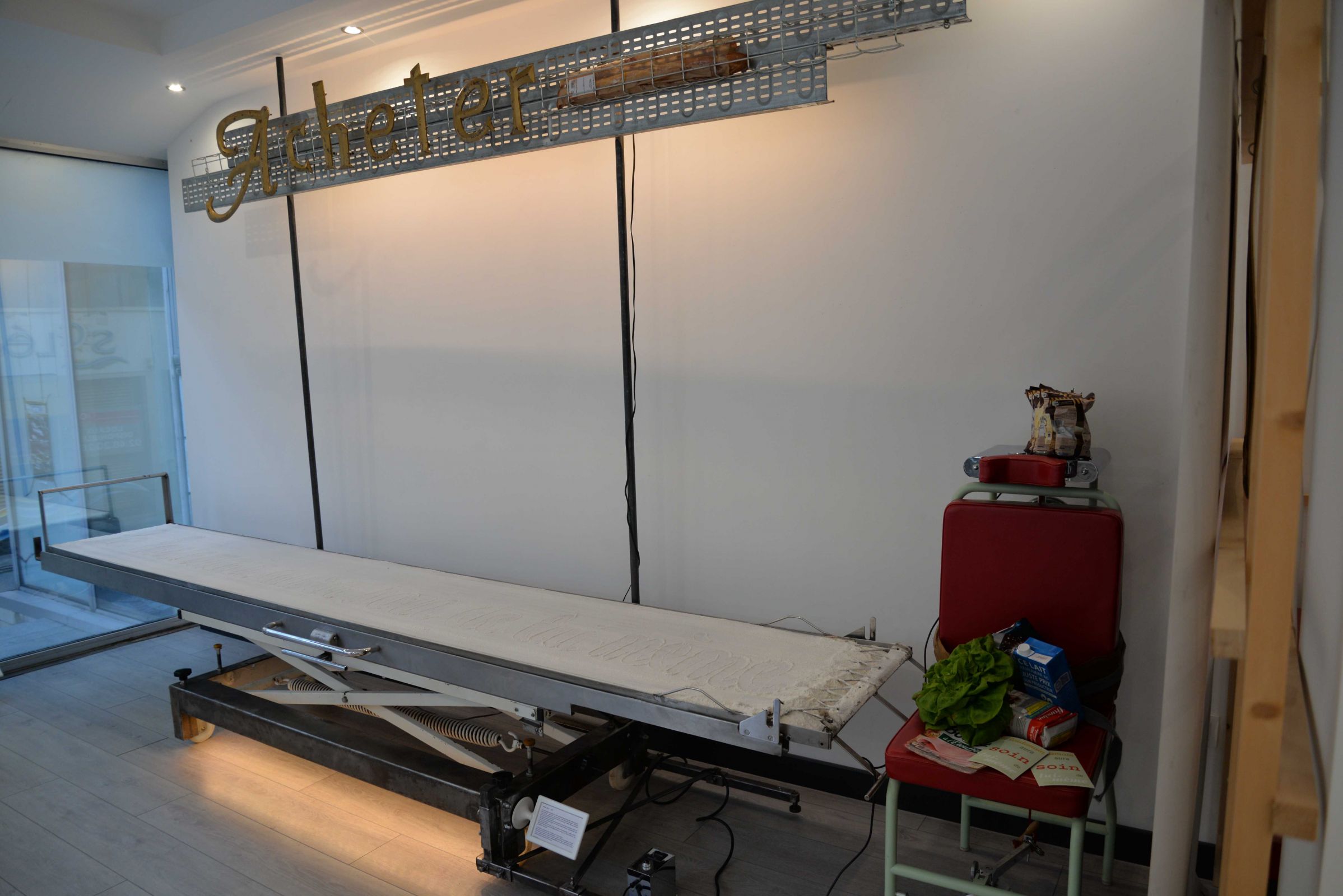 Installation composée de 3 éléments : élévateur/enfourneur de boulangerie ( acier, coton) enseigne en fonte d'aluminium et passe-cables en acier galvanisé, chaise orthopédique en acier , assise en skaï