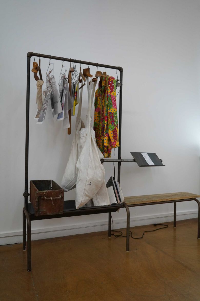 Cintres et baladeuse électrique, banc Mullca, tube chauffage et plaque acier pliée, bois.