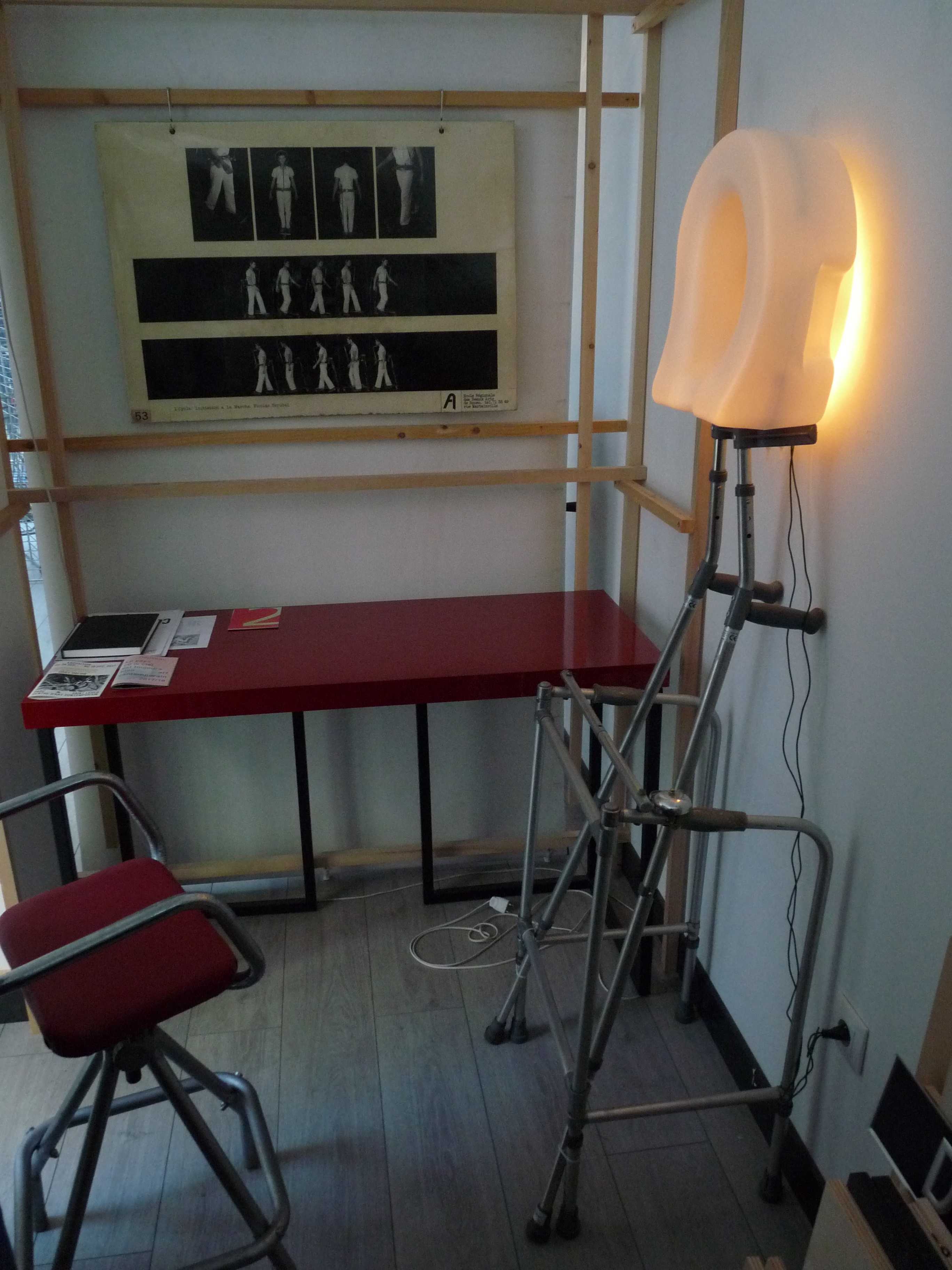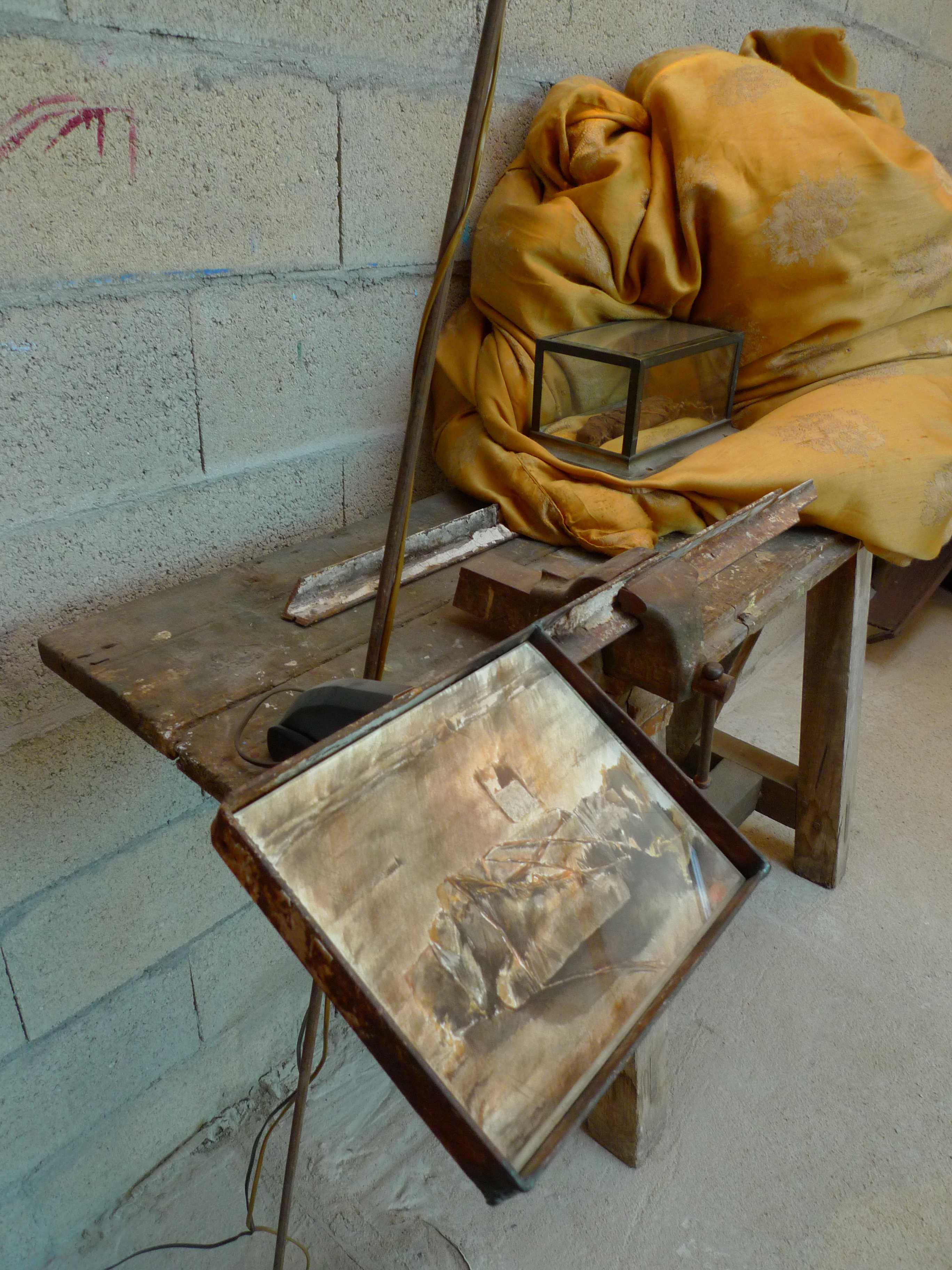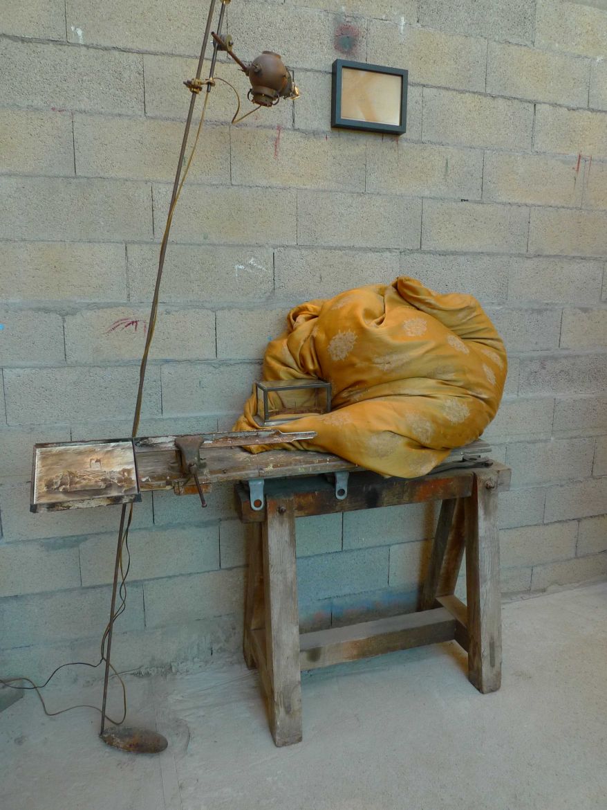 Spot à lentilles monté sur tige métallique et contre-poids, éclairage escamotable, aquarelle encadré dans un châssis métallique provenant d'une véranda, vitrine/reliquaire, ardoise d'écolier, gonds de porte enveloppé dans du tissus avec ligatures, tréteau, établi, montage acier galvanisé, édredon en plumes d'oie et coutil de soie