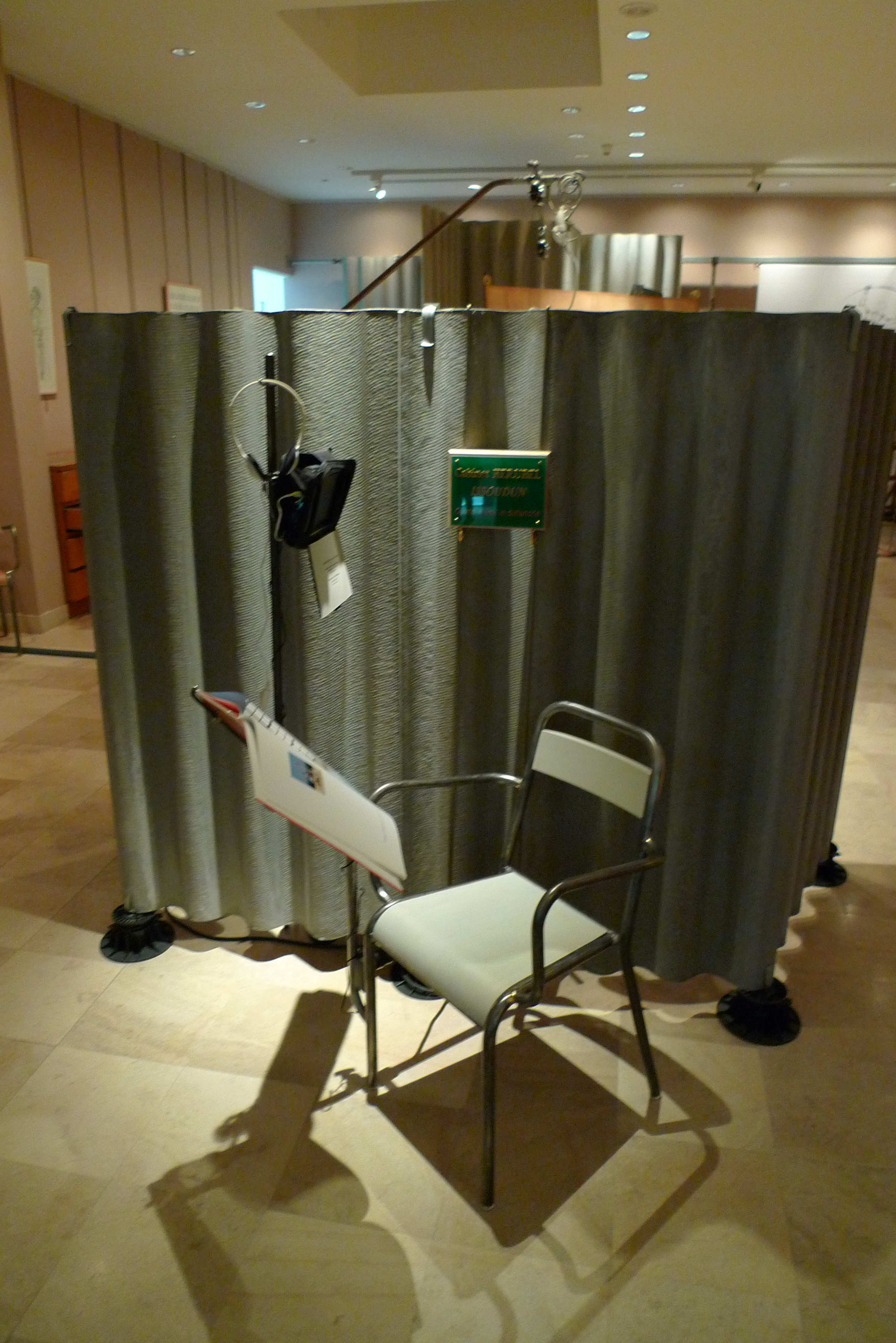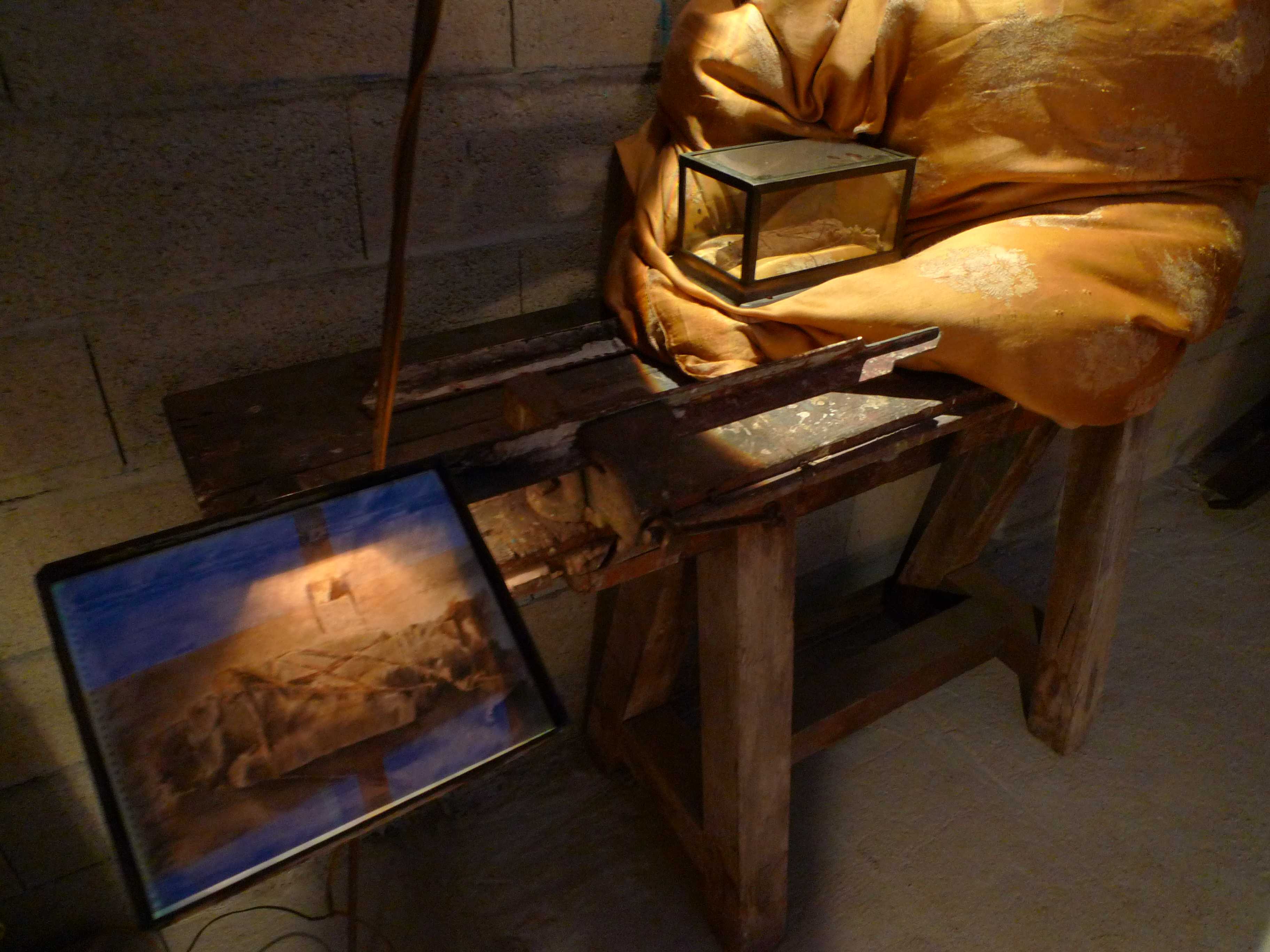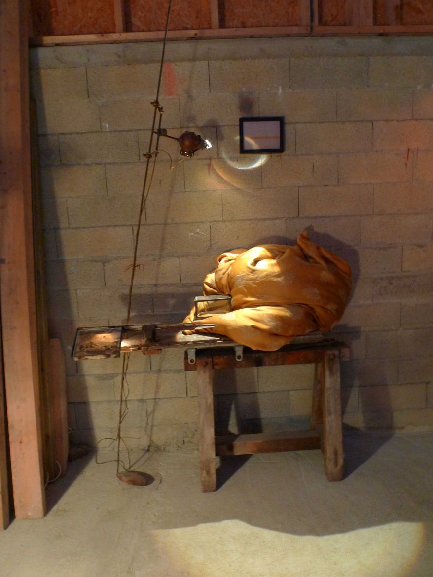 Spot à lentilles monté sur tige métallique et contre-poids, éclairage escamotable, aquarelle encadré dans un châssis métallique provenant d'une véranda, vitrine/reliquaire, ardoise d'écolier, gonds de porte enveloppé dans du tissus avec ligatures, tréteau, établi, montage acier galvanisé, édredon en plumes d'oie et coutil de soie
