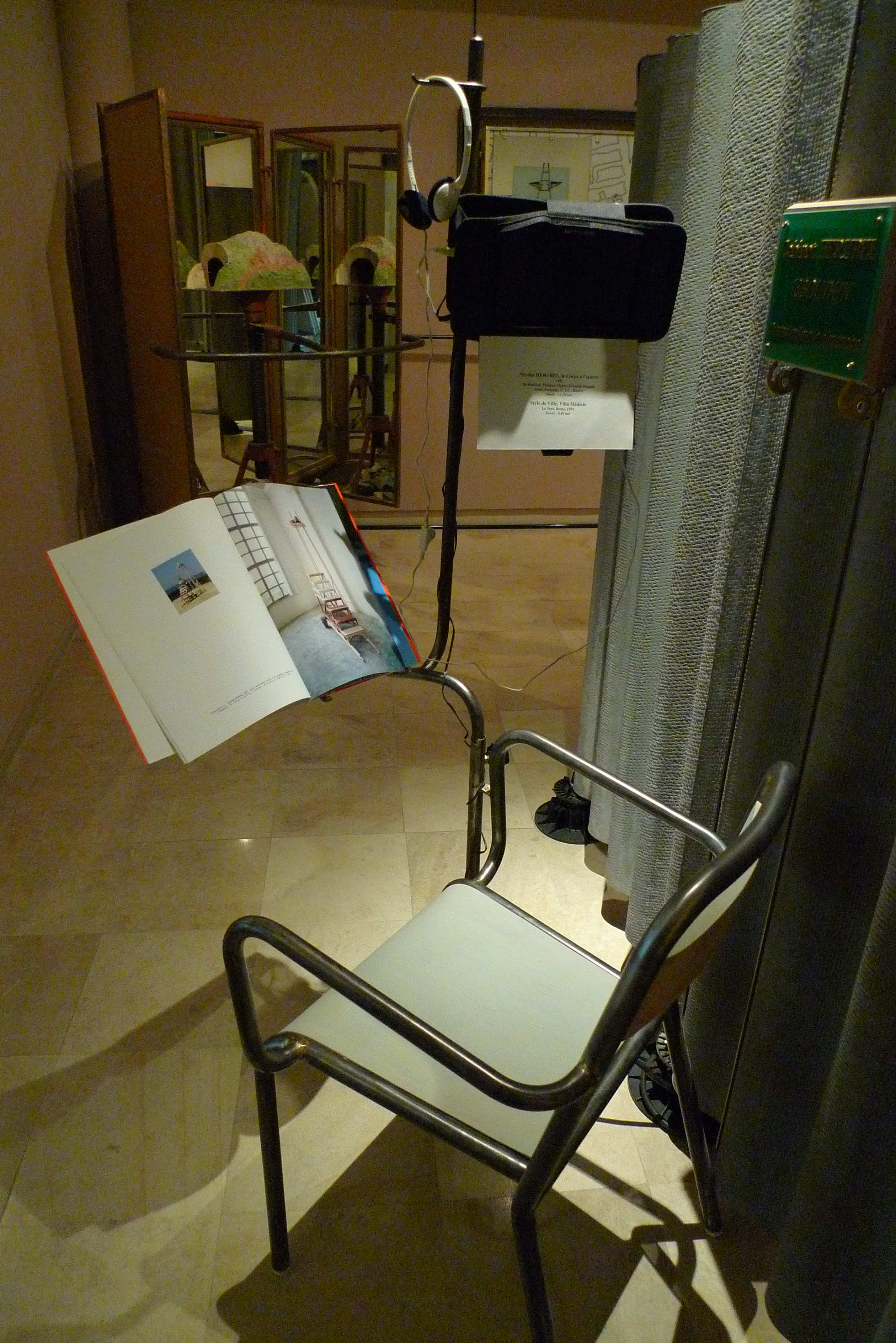 Ensemble de 3 fauteuils avec pupitre et borne de lecture vidéo.