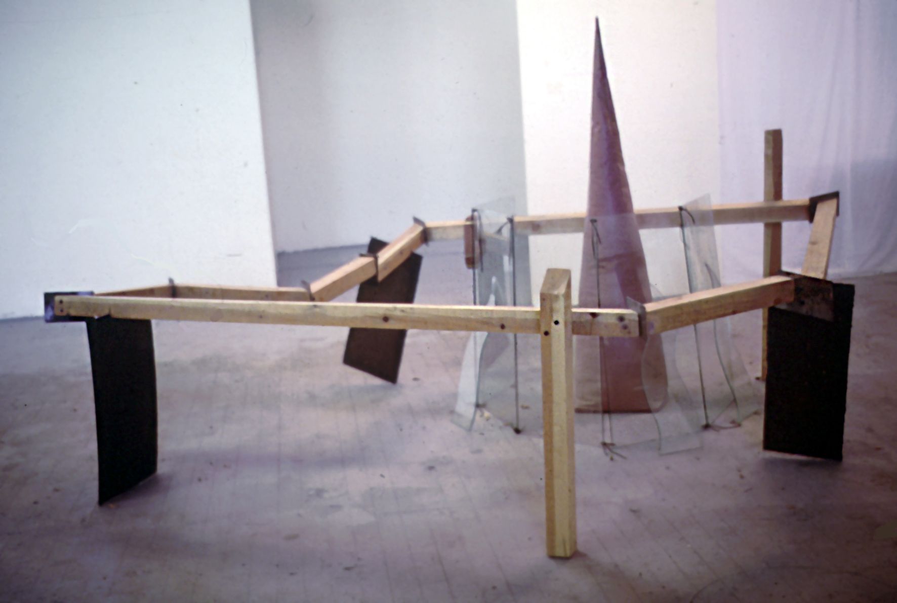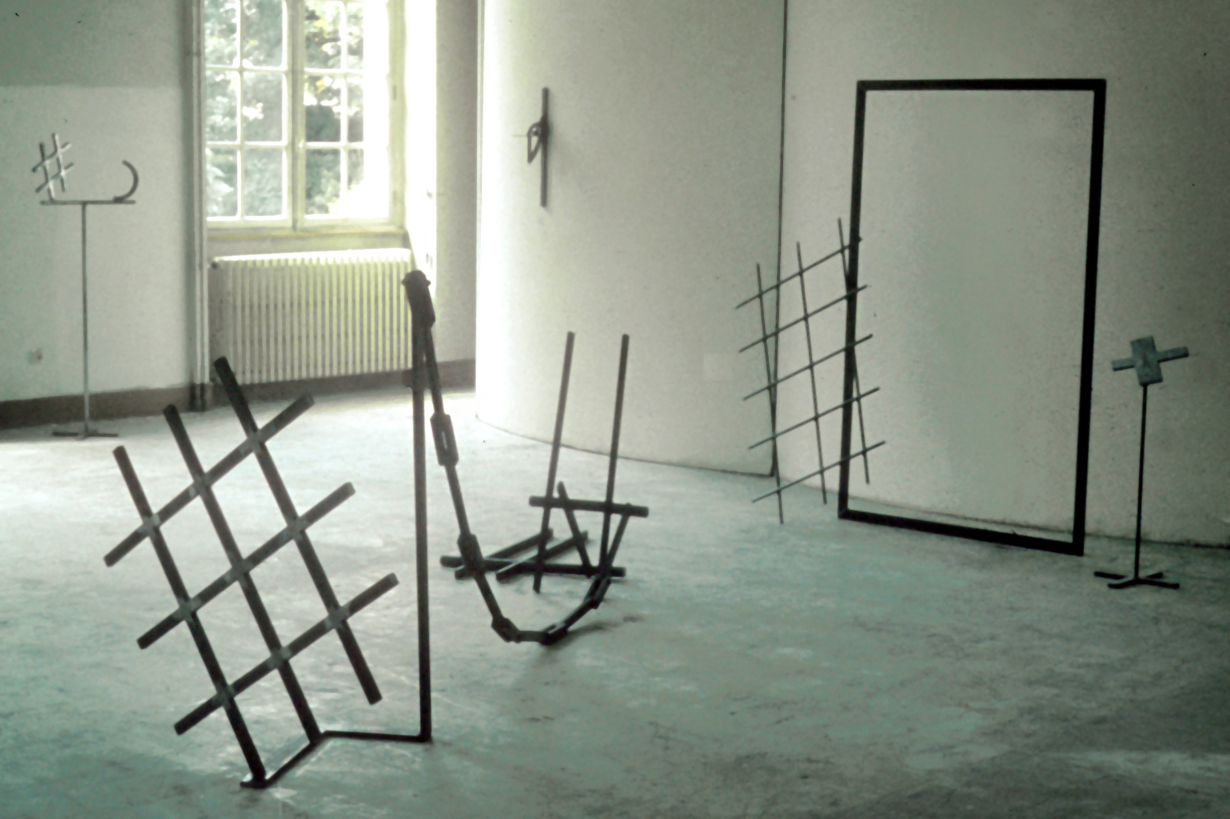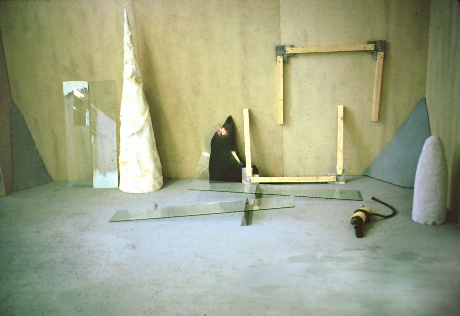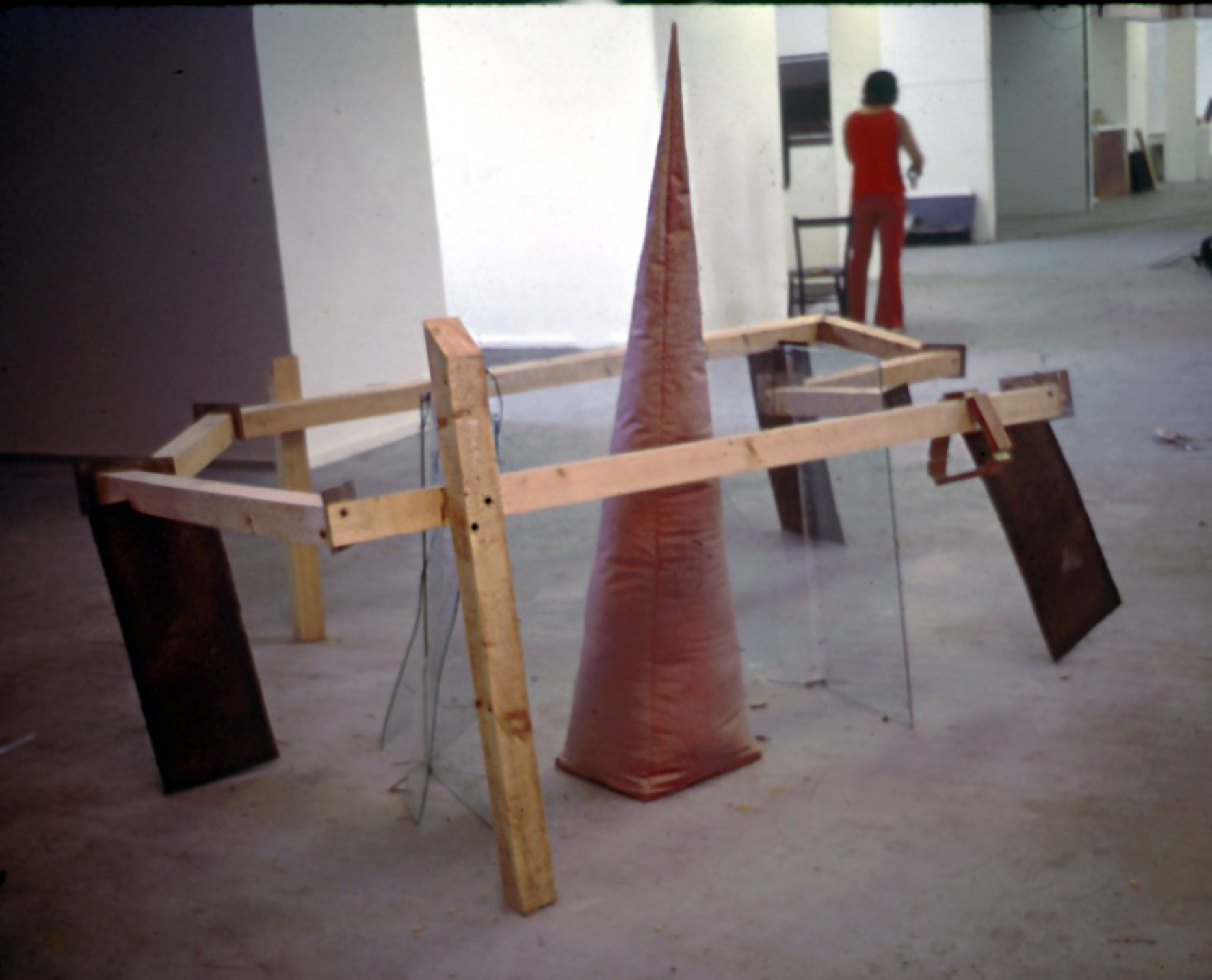 Dans ce contexte bouillonnant post 68, la question de la performance était déjà un vrai sujet, (il avait réalisé de 66 à 72 quelques actions) ainsi que la question corollaire des objets qui pouvait accompagner, voire être au centre de ces actions, se posait. Les pièces qu’il fabriquait à cette époque participaient à cette réflexion, une première série de pièces recouverte de résine et de gravier et une autre où les éléments faisait partie d’un travail sur la notion de la cérémoniale, influencé aussi bien par par le spectacle du premier homme sur la Lune (Neil Armstrong, 21 juillet 1969), que les vidéos grisâtres de Beuys transportant des poutres, que les récits de rituels ésotériques trouvés dans la librairie londonienne du fils de Alexander Crowley.