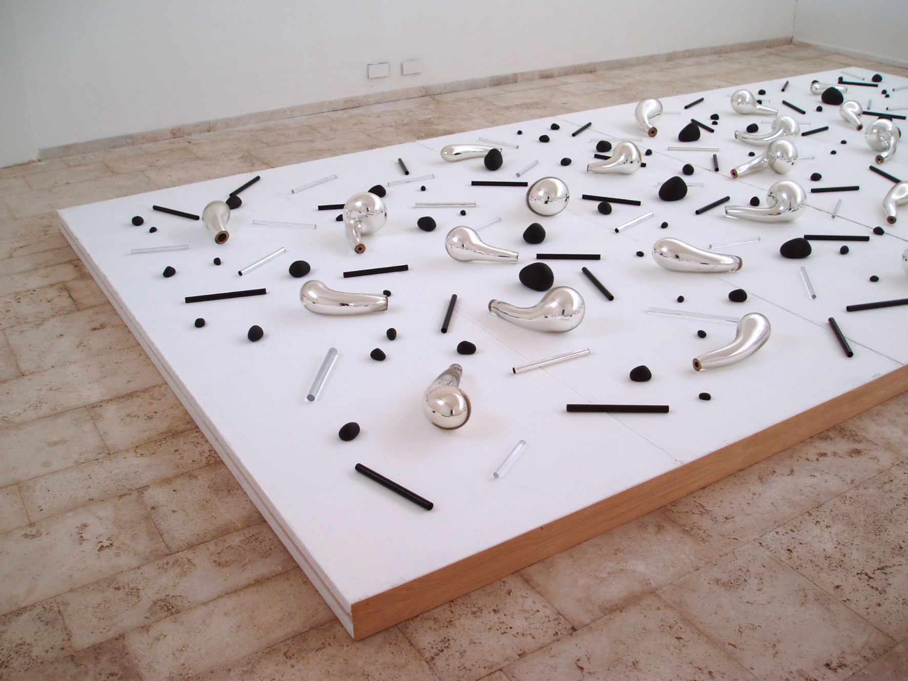 Acier émaillé, tube de verre argenté, faux galets et verre soufflé argenté, 2002-2003.