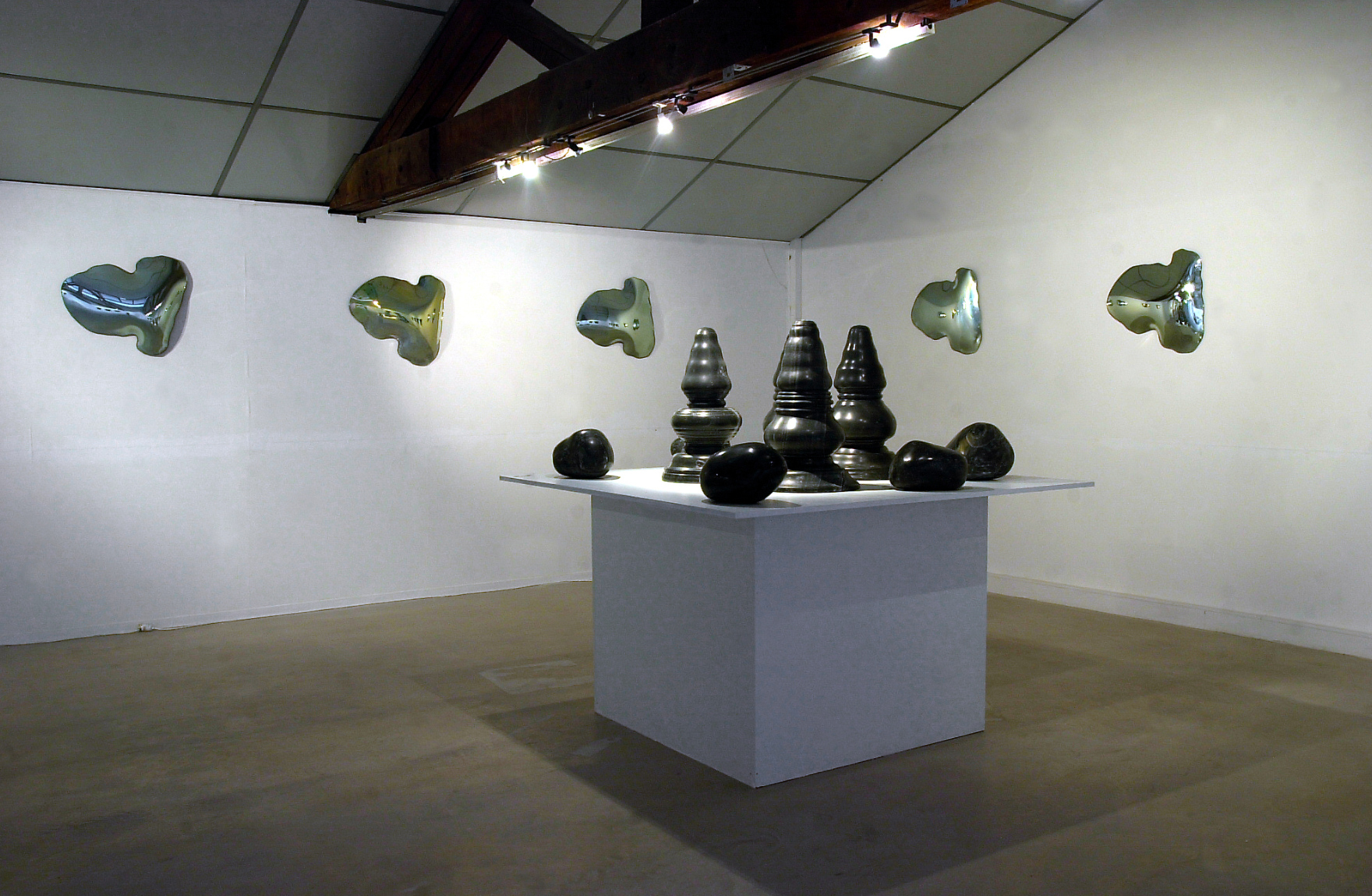 Sans titre, mélange verre argenté thermoformé, support manufacture de Sèvres, galets, 1999-2001.