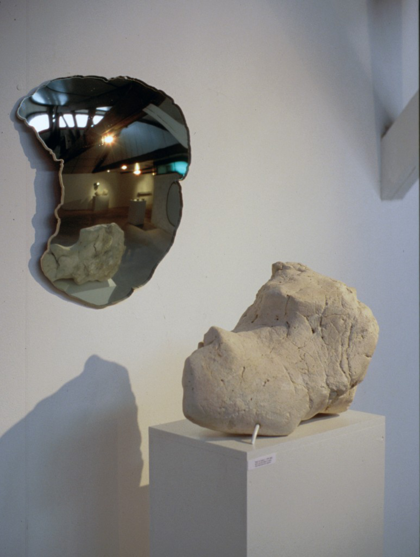 Pierre et miroir, verre thermoformé, découpé et argenté, pierre calcaire naturelle retaillée, résistance électrique, 1998-2001.